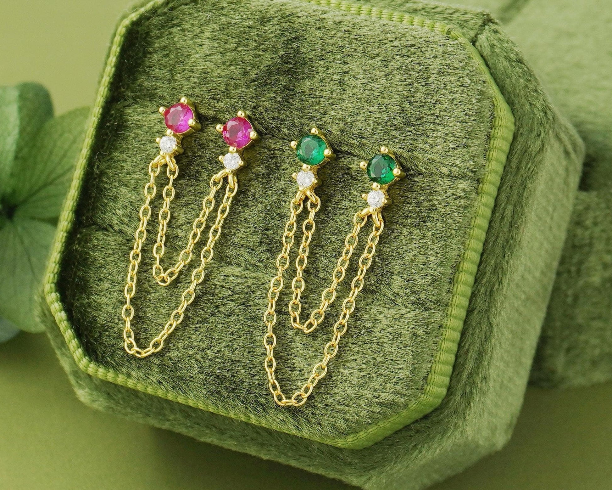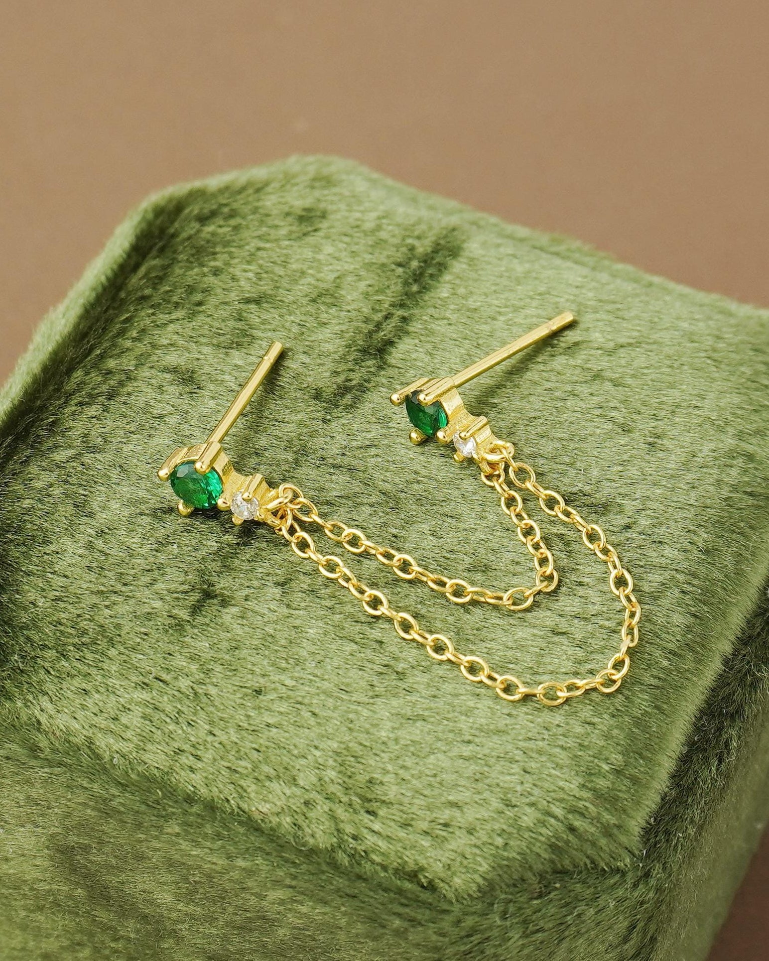 1 pc of Duo Emerald Green CZ Gem Stud Earring in Gold Plated over Sterling Silver, Dangly Double Chain, Layer Tassel Lobe & 2nd Hole Piercing