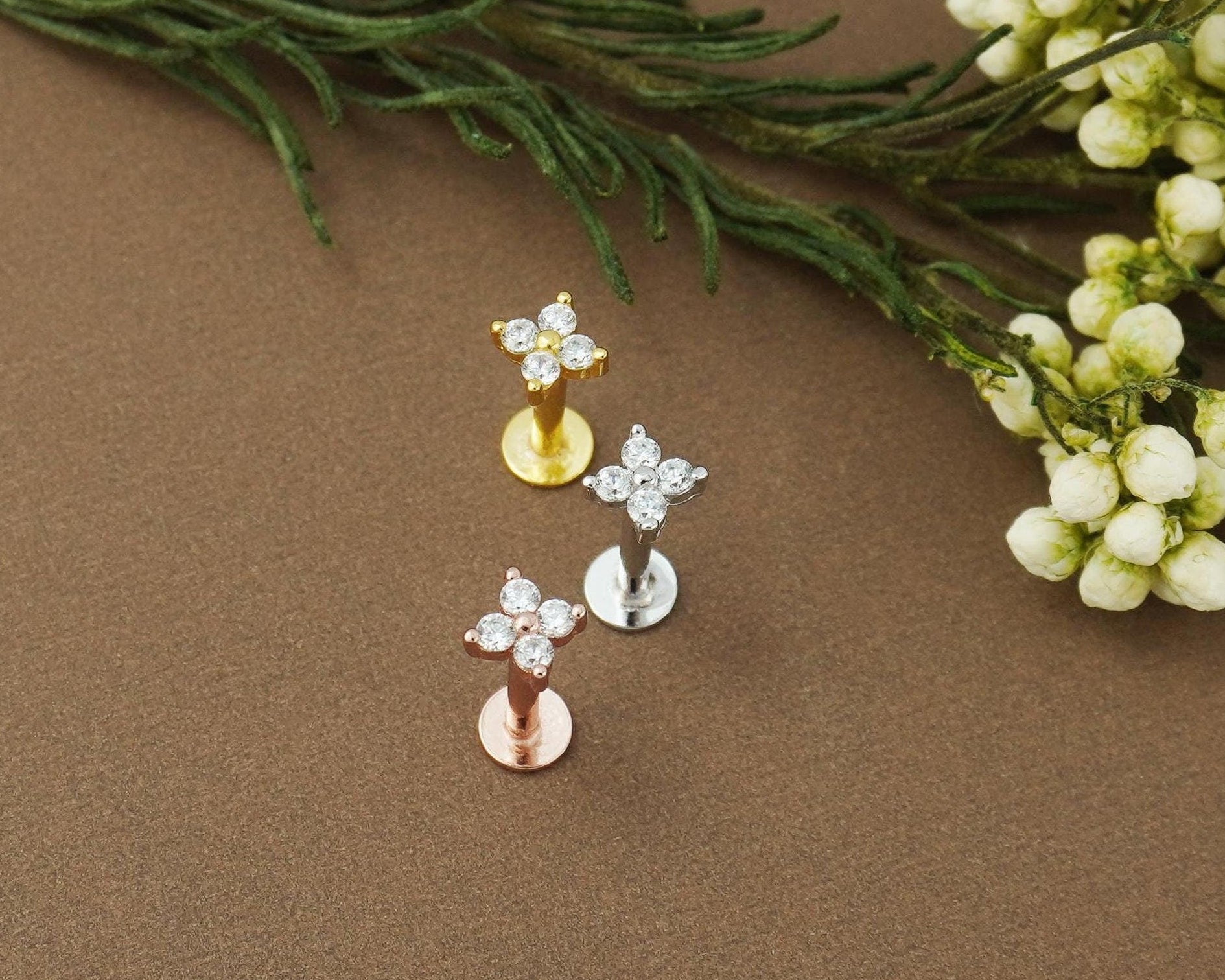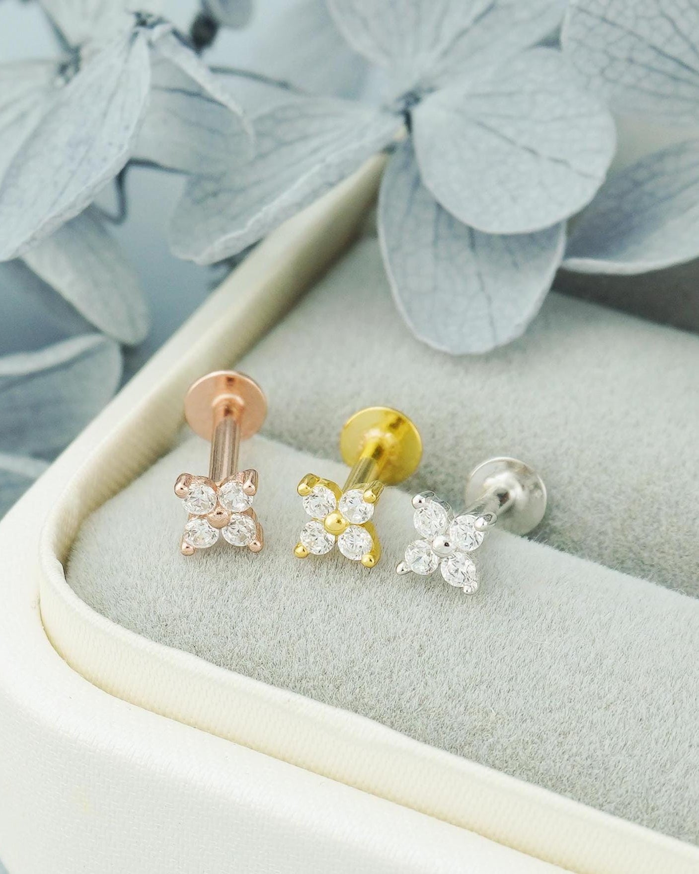 Quartet CZ Hydrangea Flat Screw Back Stud Earring in Sterling Silver, Gold or Rose Gold Finish