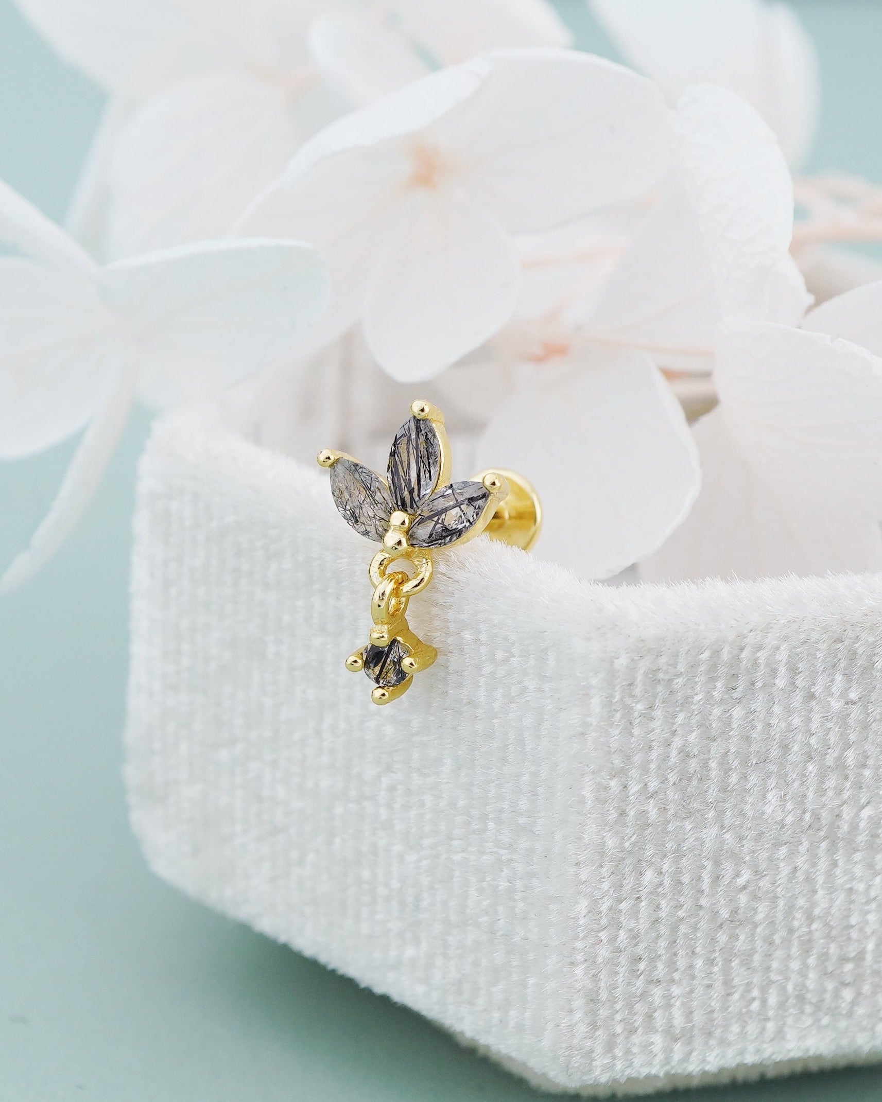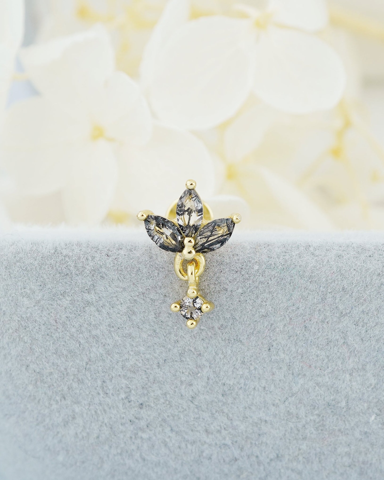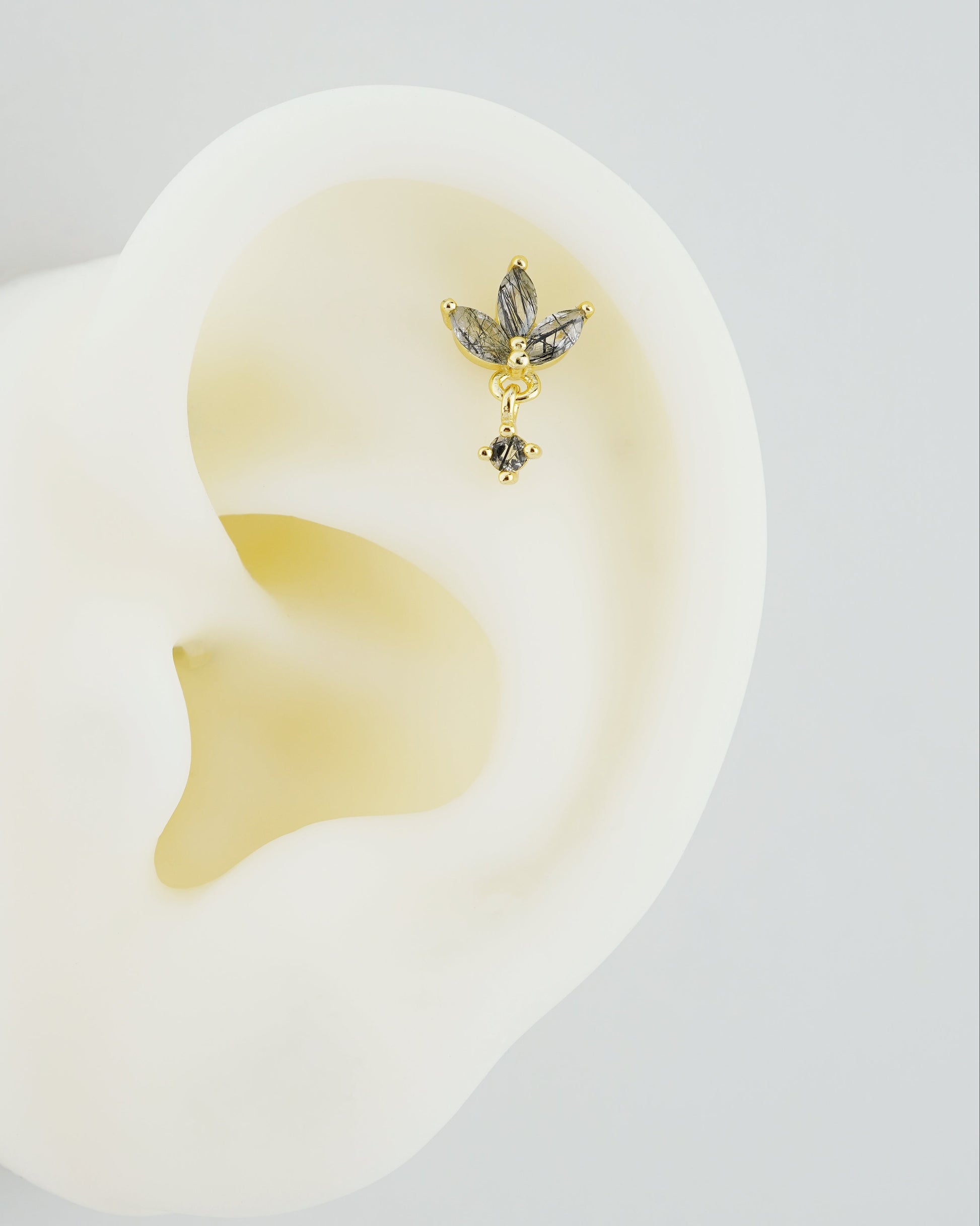 1 pc of Natural Black Rutile Quartz Sterling Silver Stud Earring in 18ct Gold Plated, Triple Marquise Design