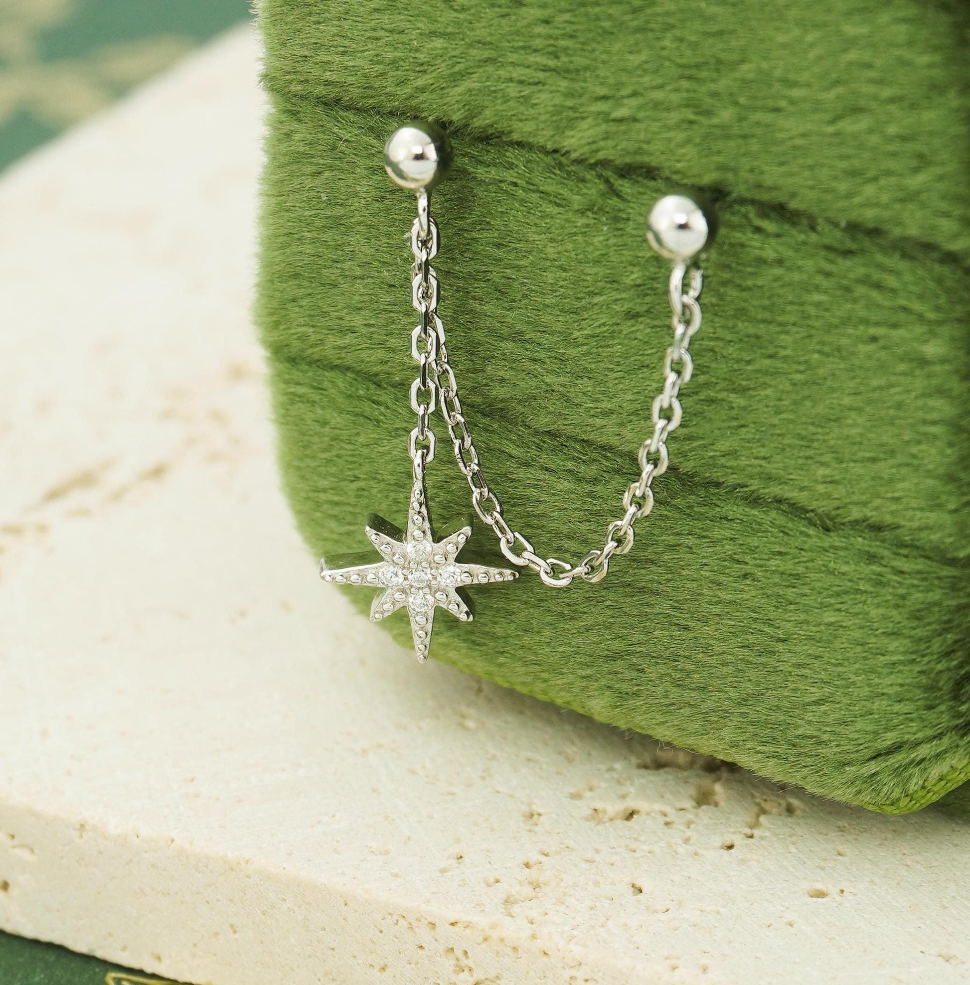 1 pc of Starburst Stud Earring in Sterling Silver or 14ct Gold Plated, Dangly Sparkly CZ Star with Drop Chain