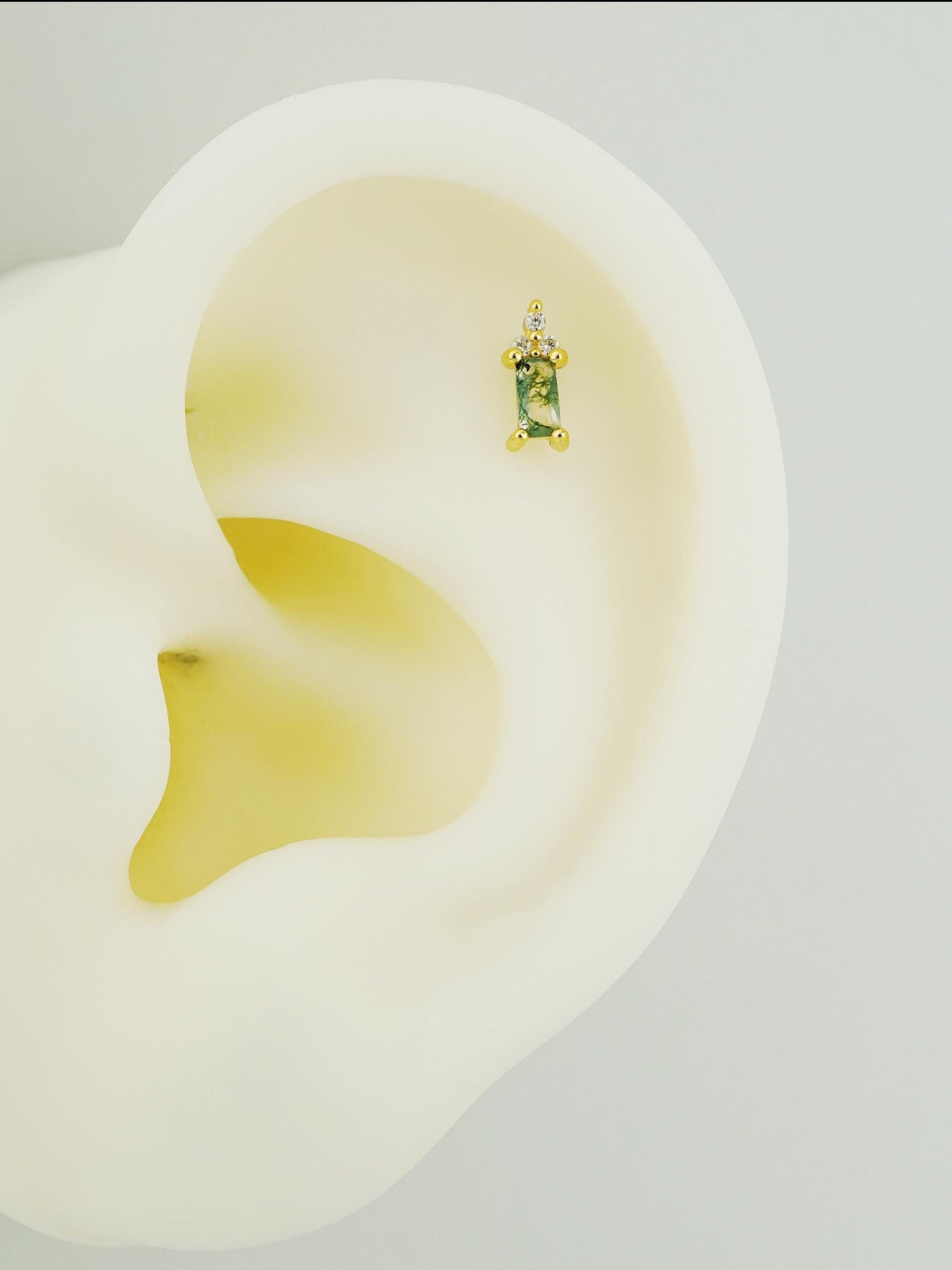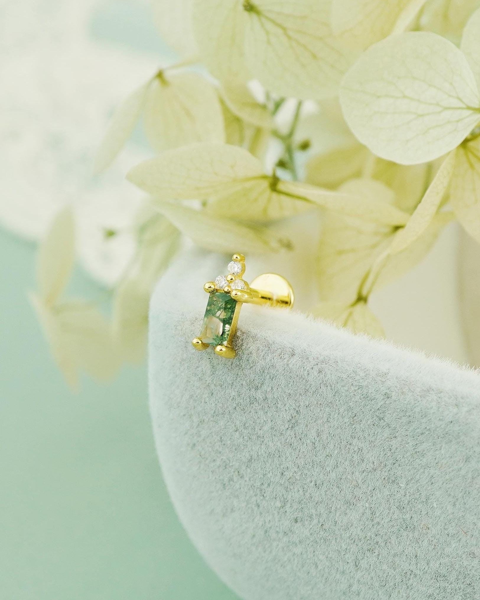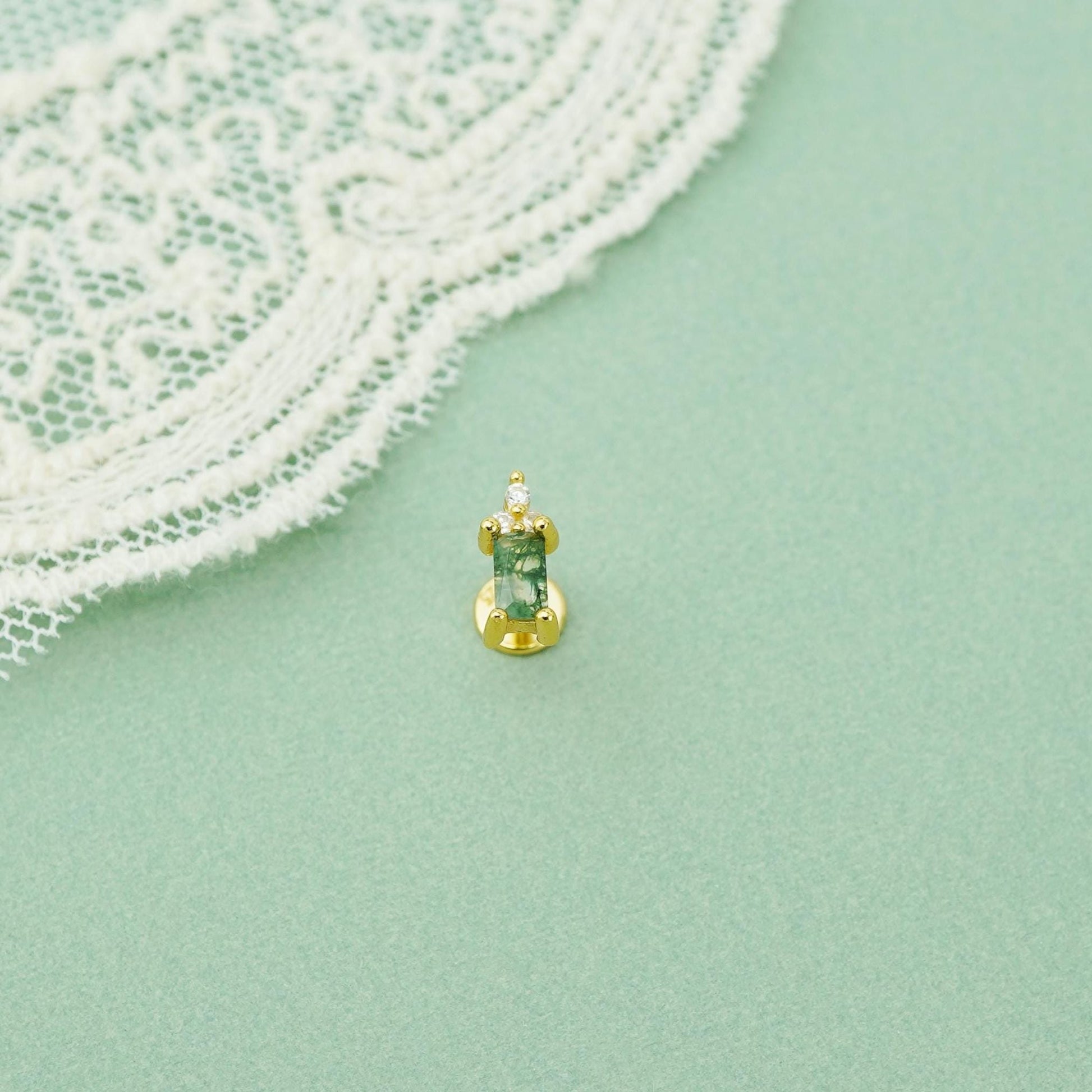 1 pc of Natural Green Moss Agate Baguette & CZ Flat Back Stud Earring in Gold Plated over Sterling Silver