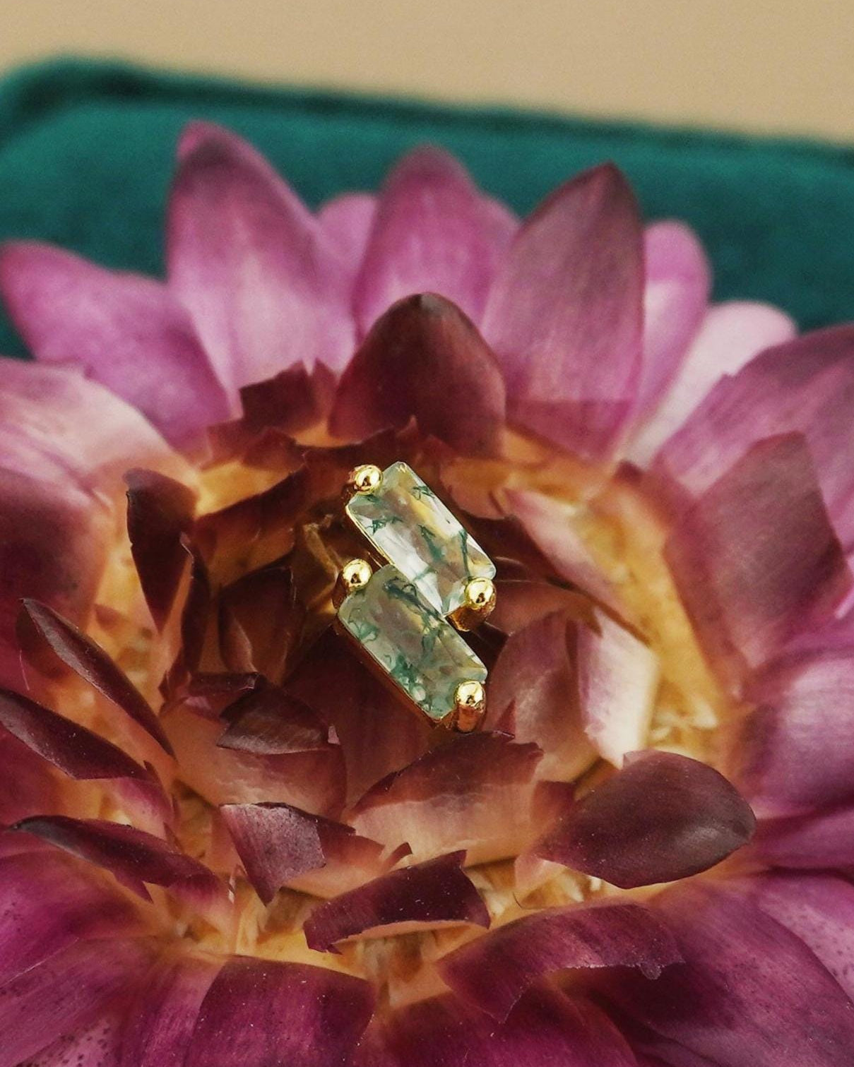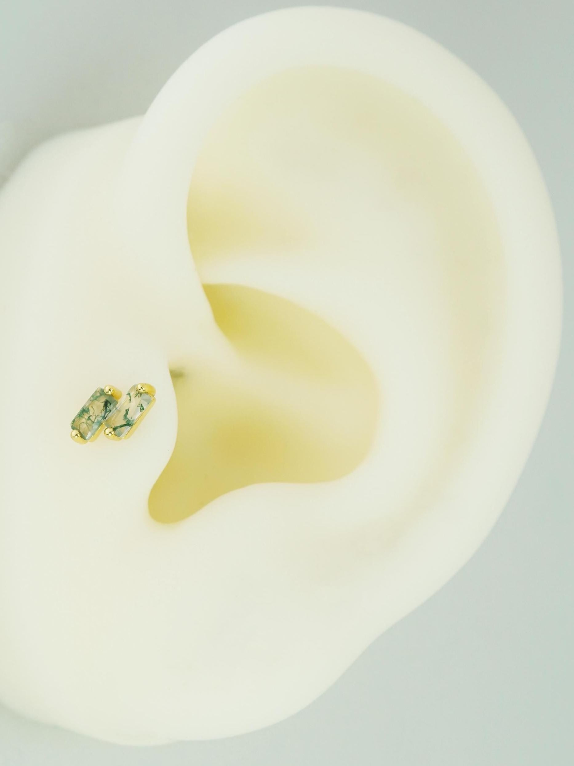 1 pc of Natural Green Moss Agate Double Baguette Stud Earring in Gold Plated over Sterling Silver, Cartilage Helix Lobe Piercing