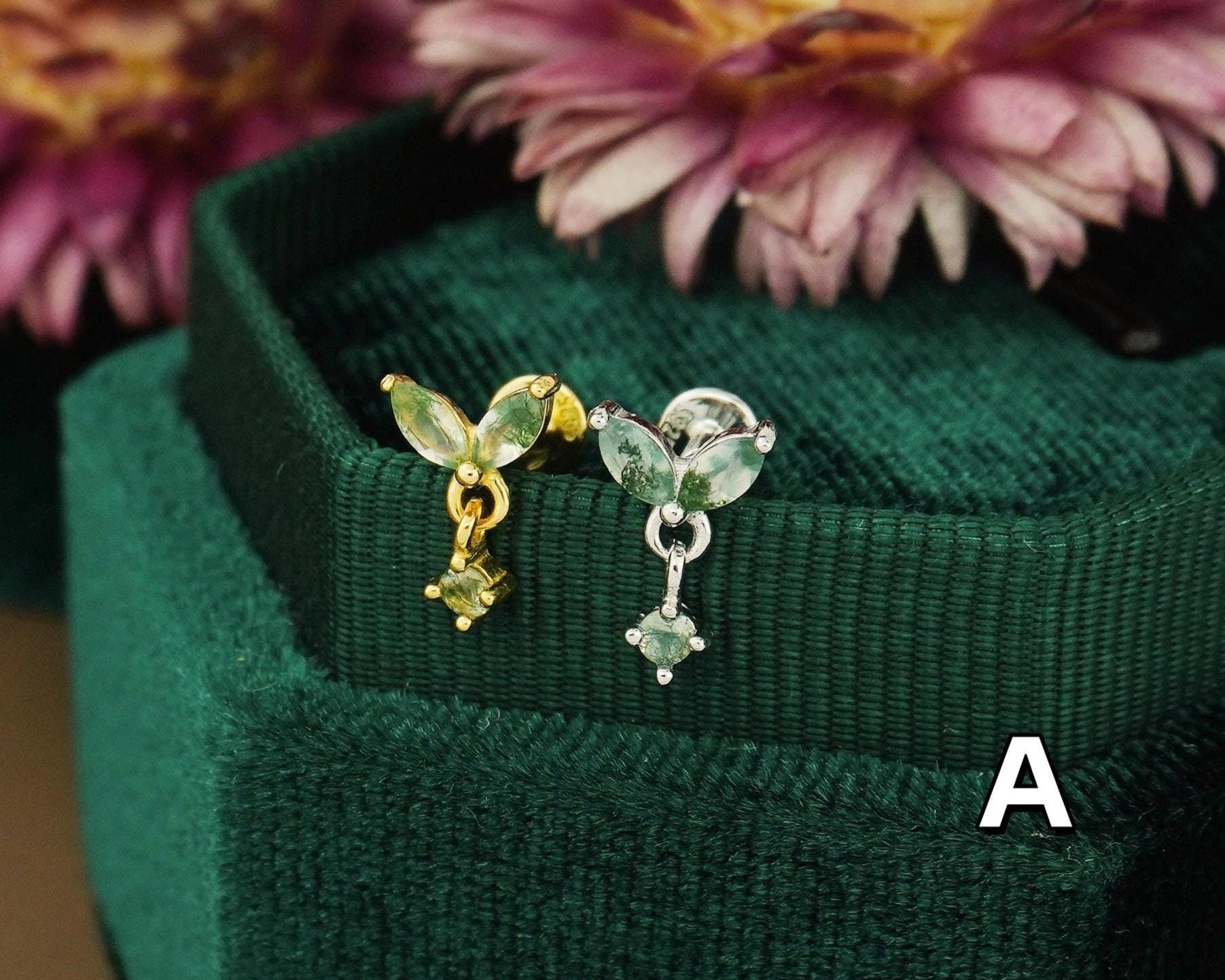 1 pc of Natural Green Moss Agate Flat Back Stud Earring in Sterling Silver/ Plated Gold