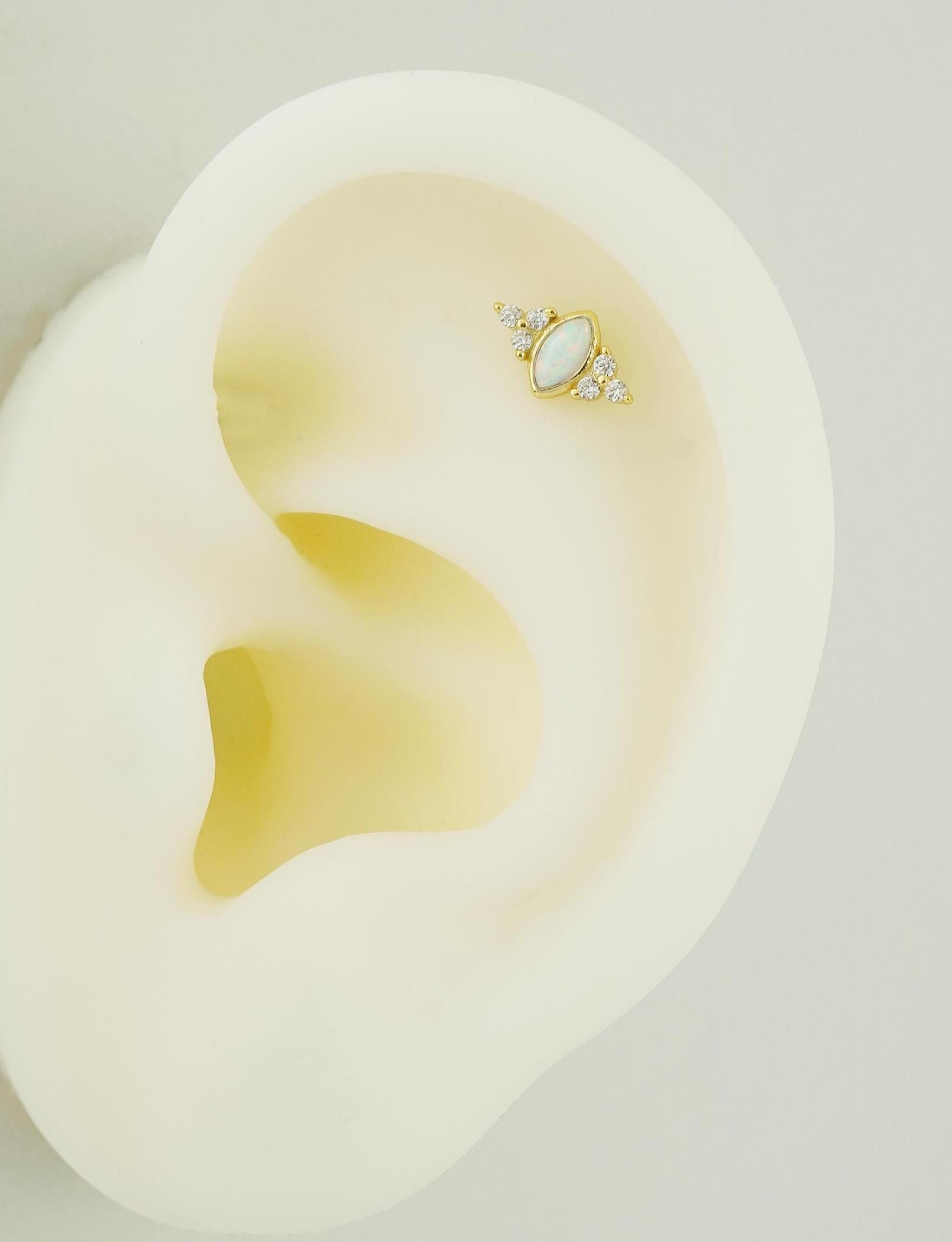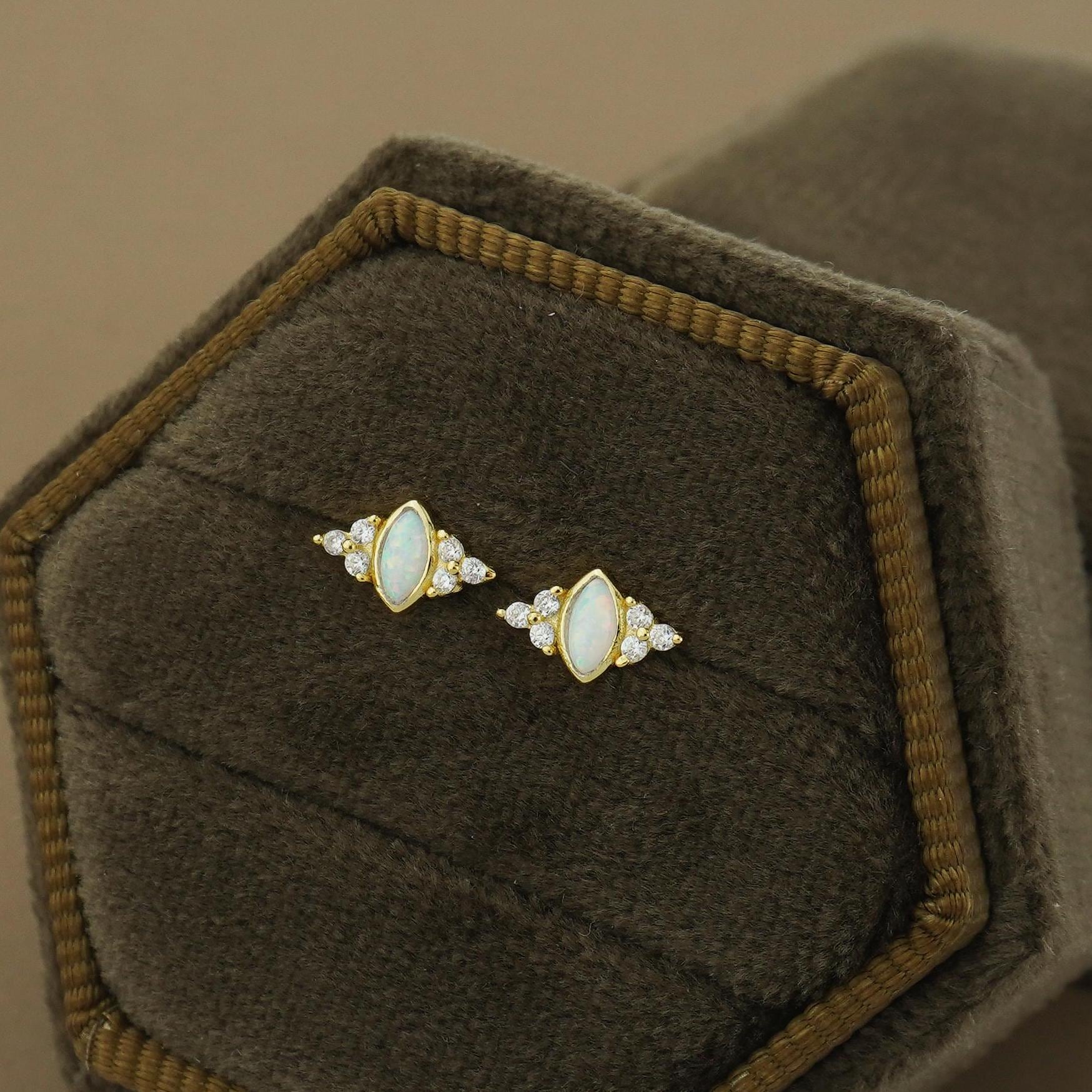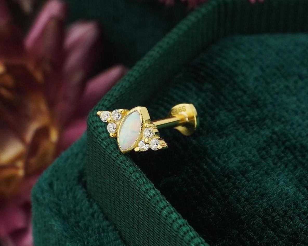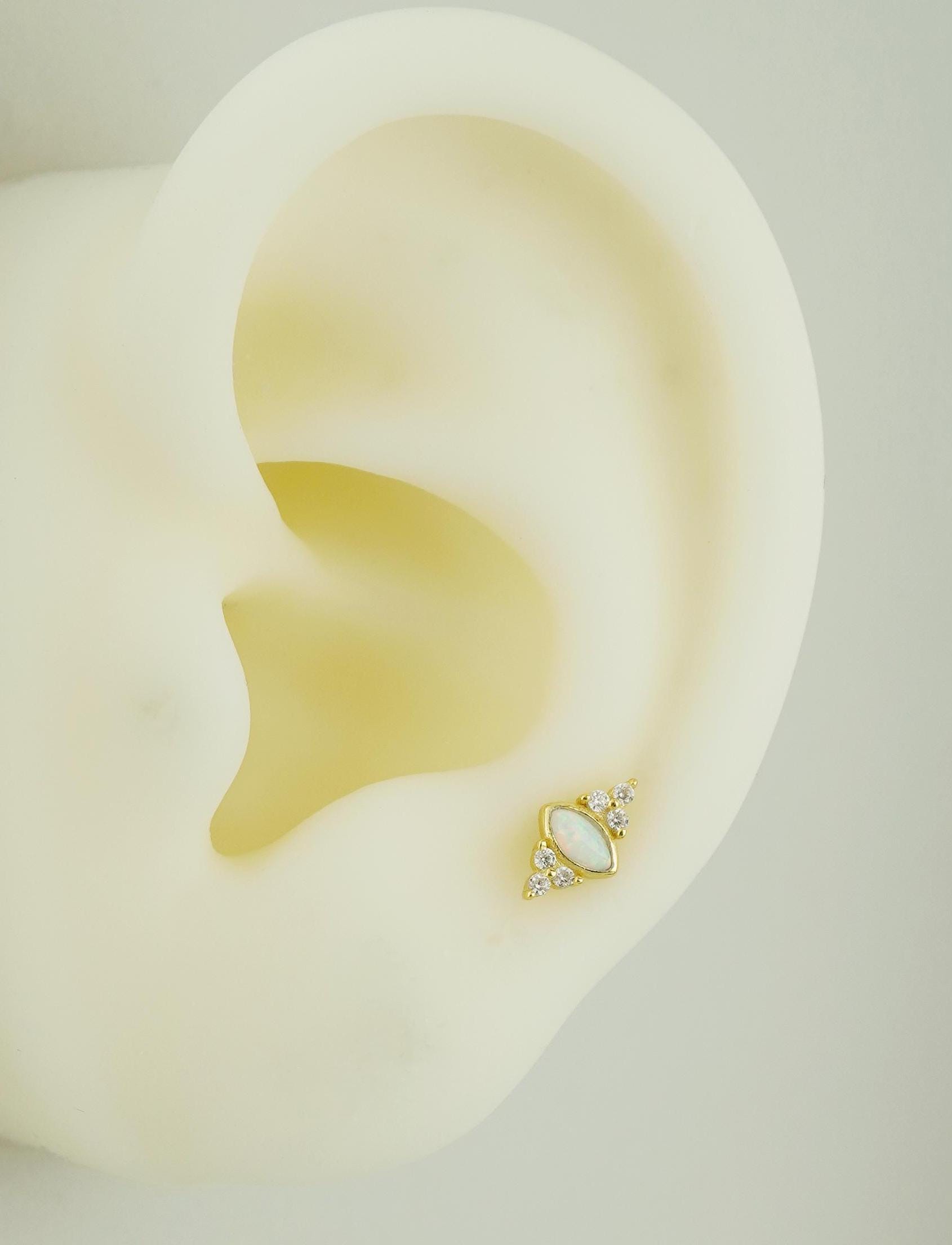 1 pc of Marquise Opal Stud Earring with Sparkly CZ Gem in 18ct Gold Plated over Sterling Silver, Lobe Tragus Cartilage Piercing Jewelry