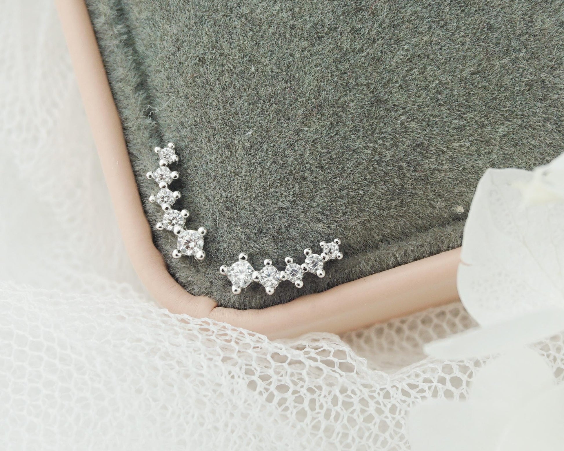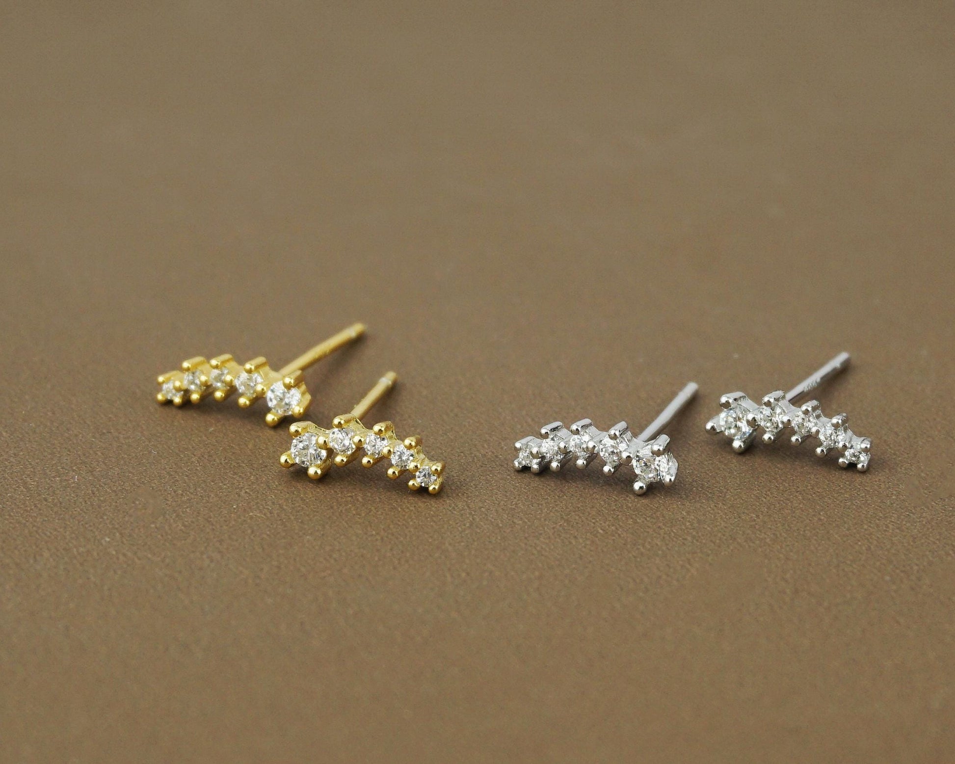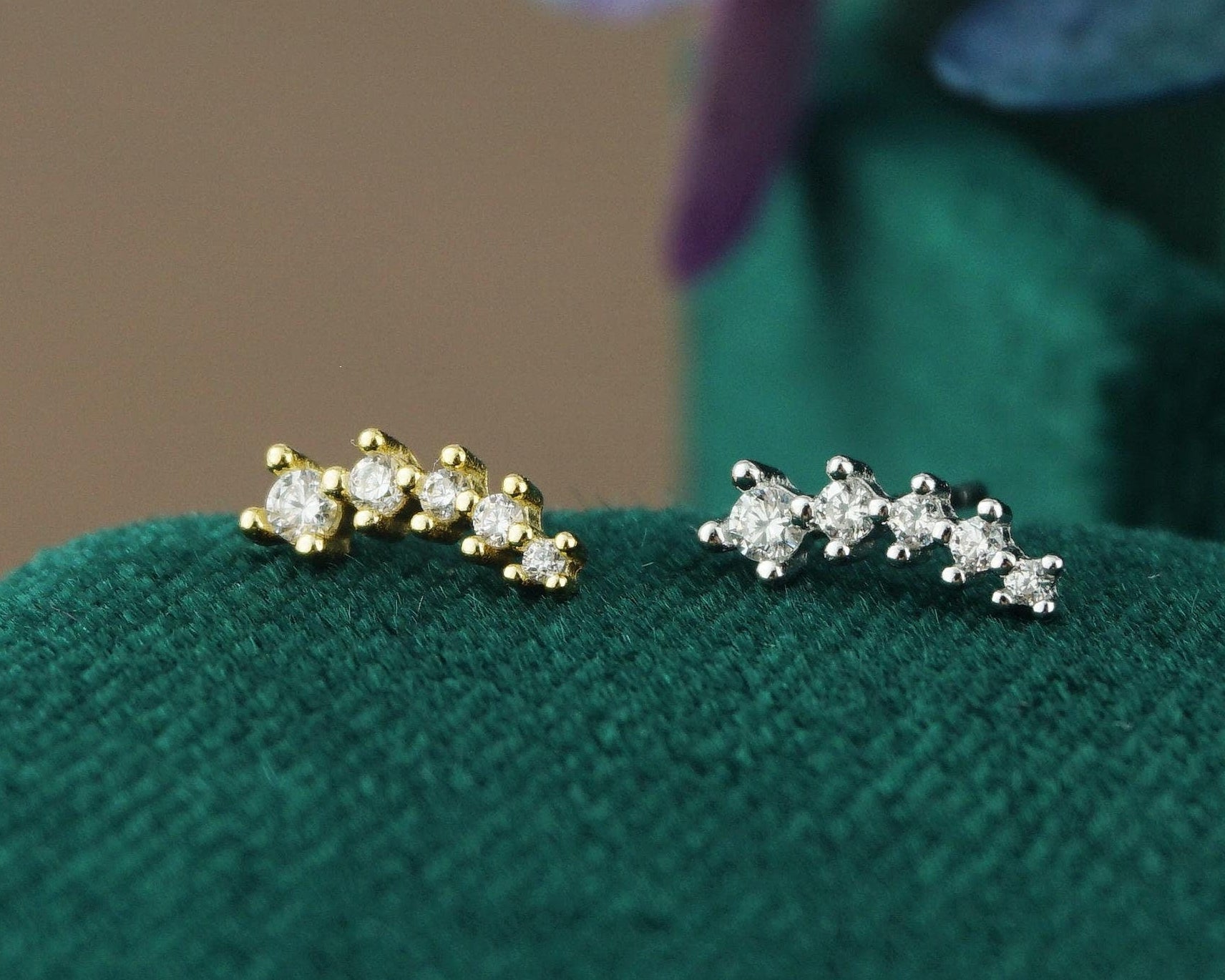 Pair of Sterling Silver 5 CZ Stud Earrings in Rhodium, Rose Gold or 18ct Gold Plated, Sparkly Star Climber