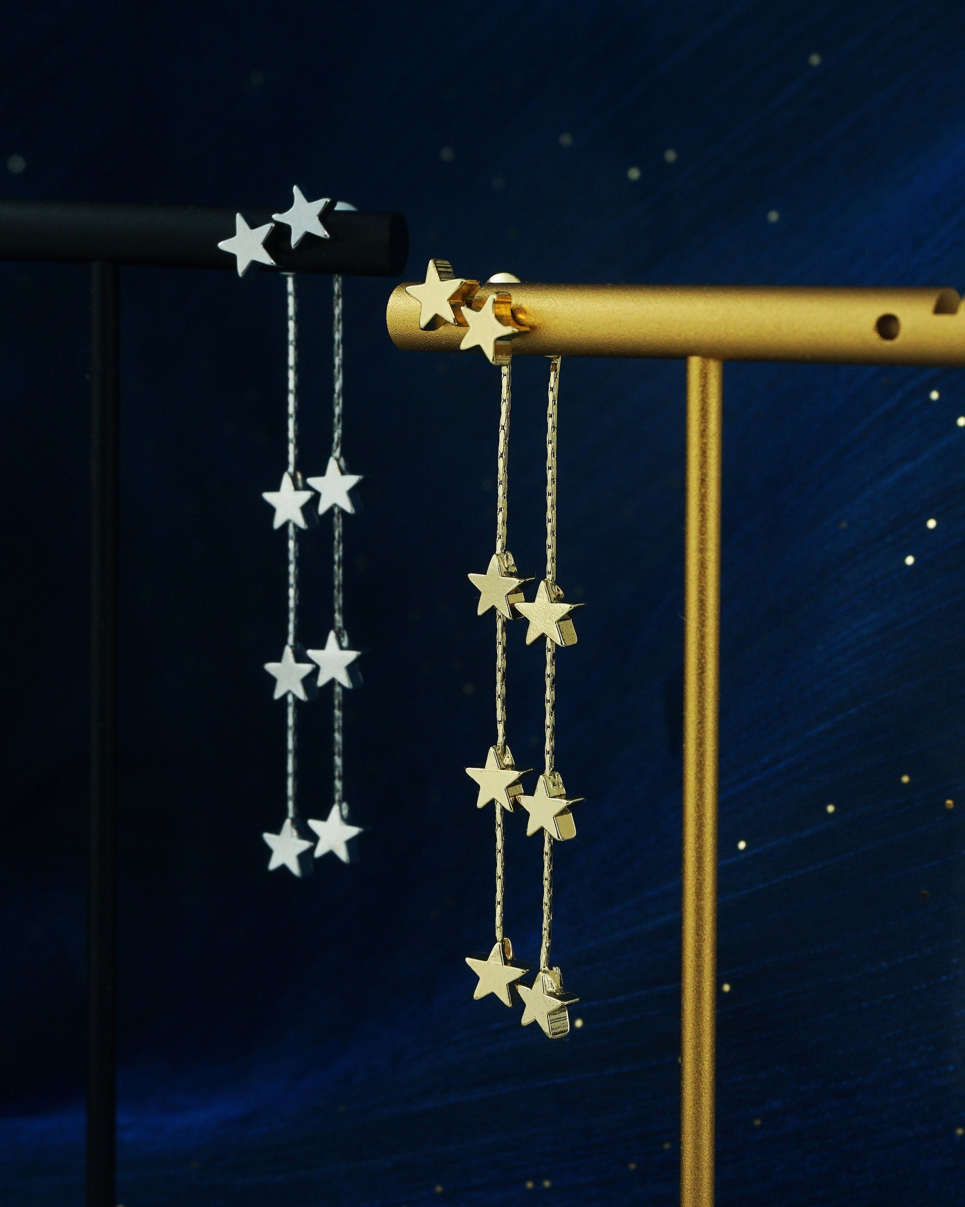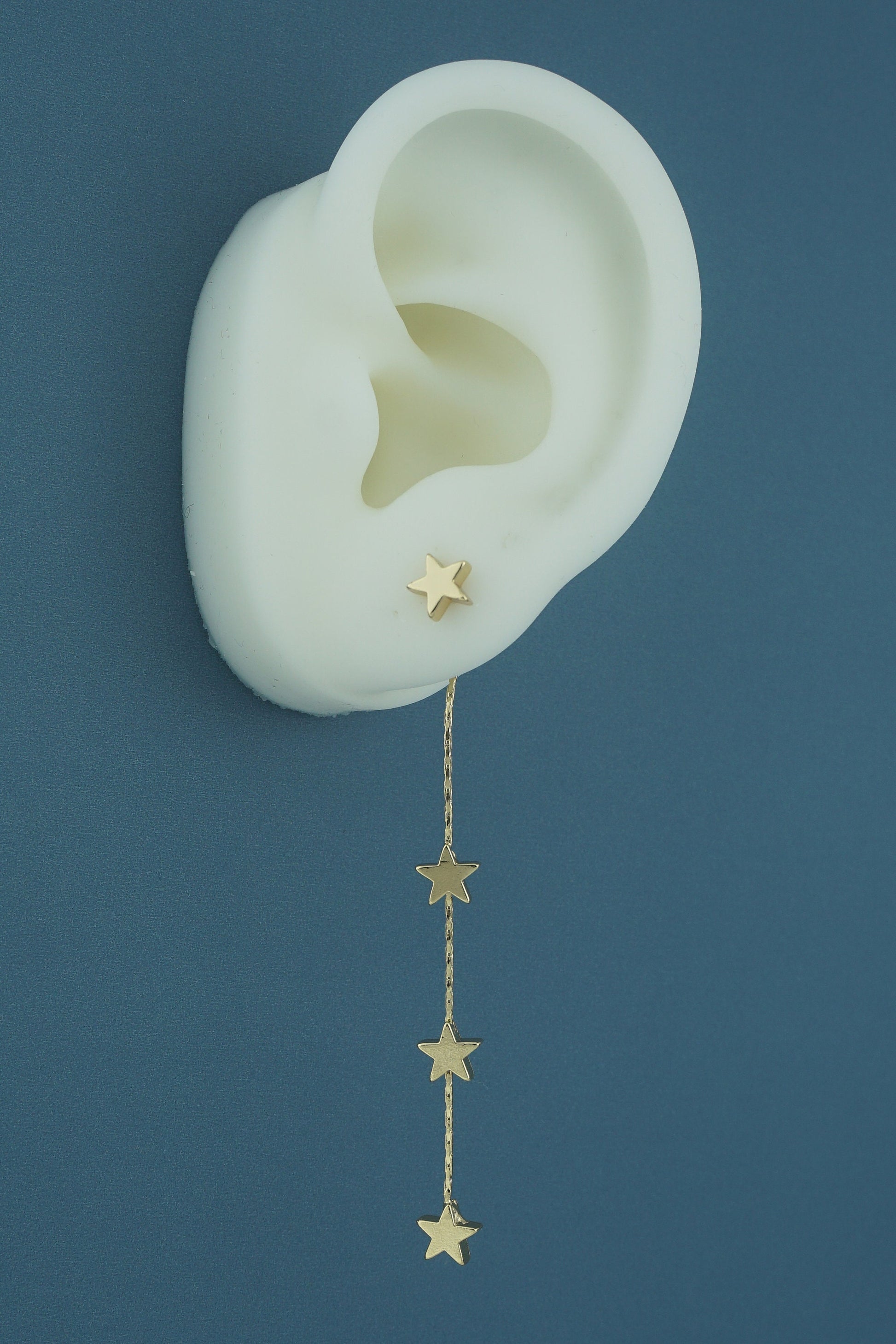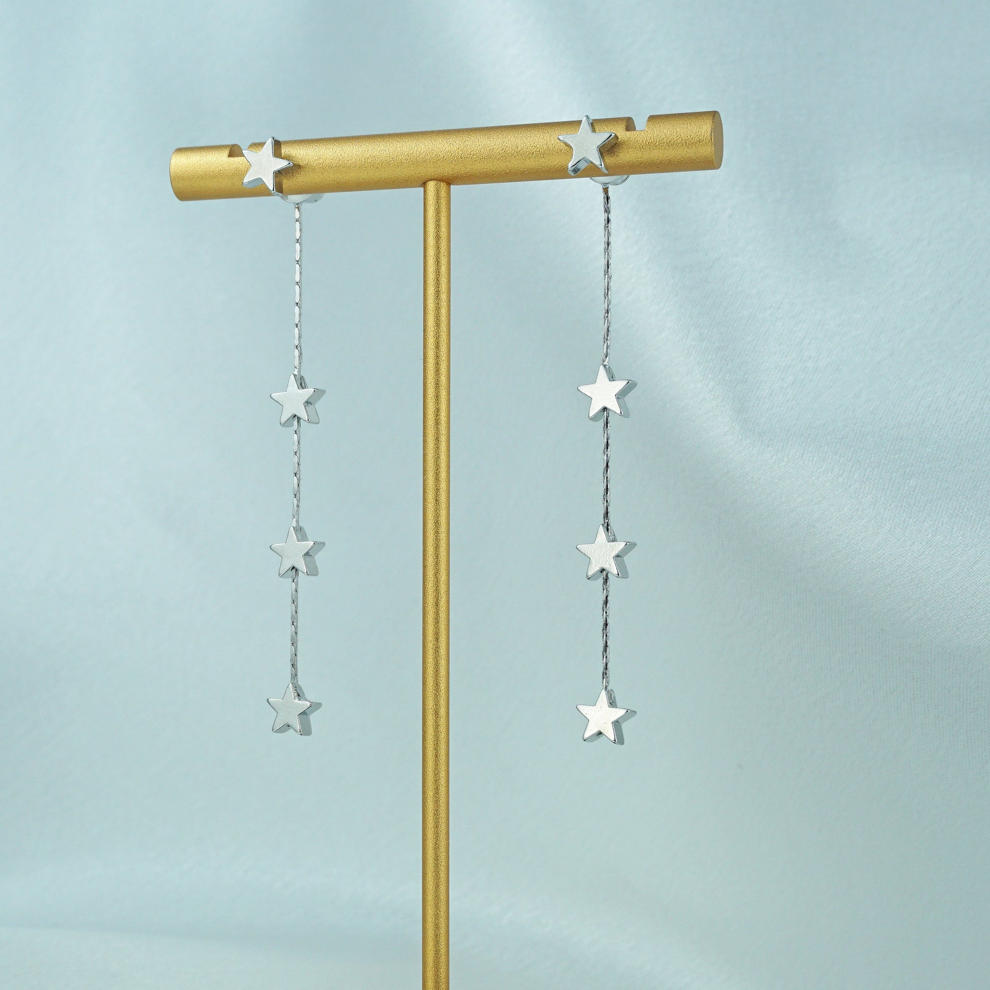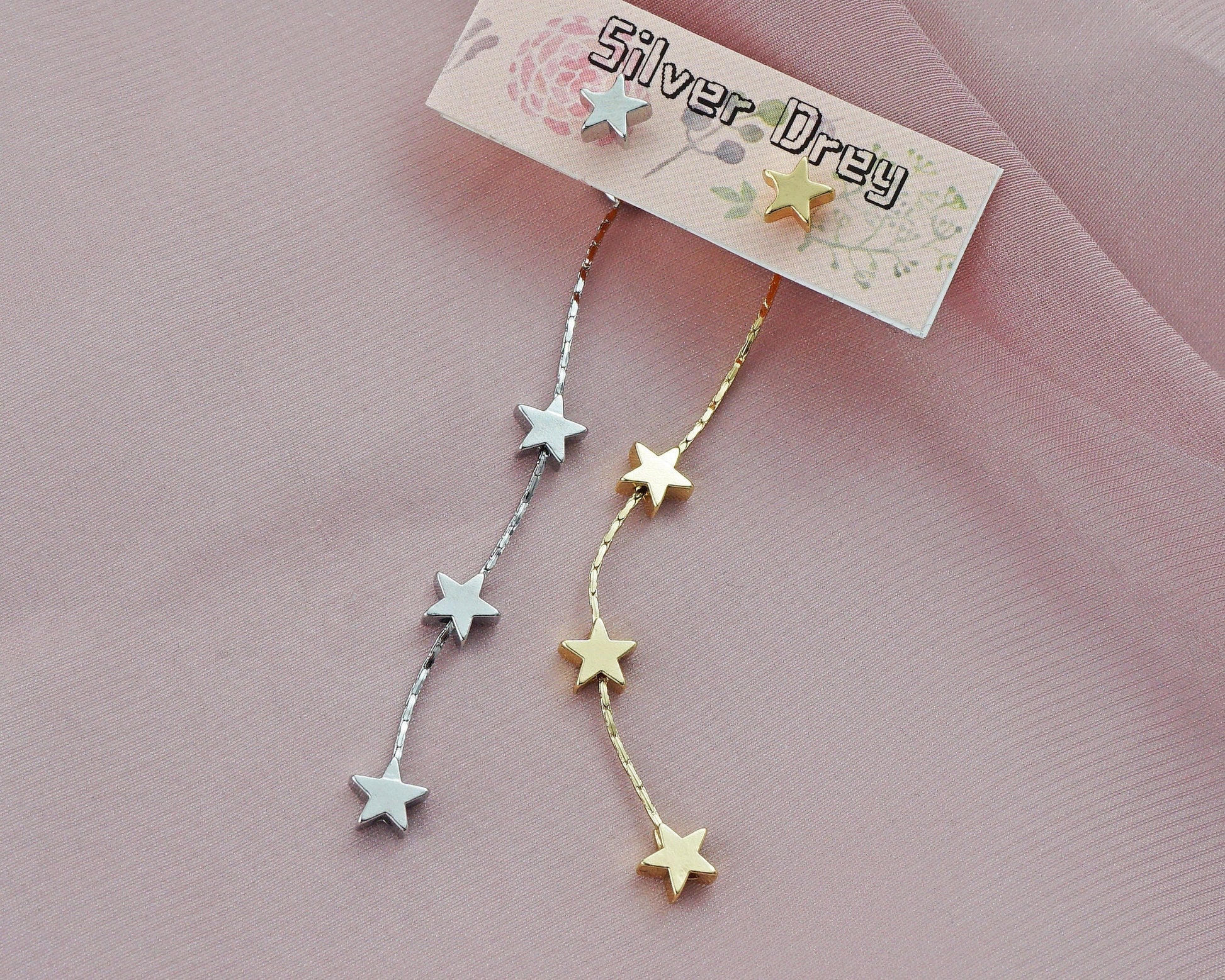 Pair of Brass Stud Earrings in Silver or Gold Finish, Dangly 3 Mini Celestial Charm on a Chain, Dainty Tassel Drop Lobe Jewelry