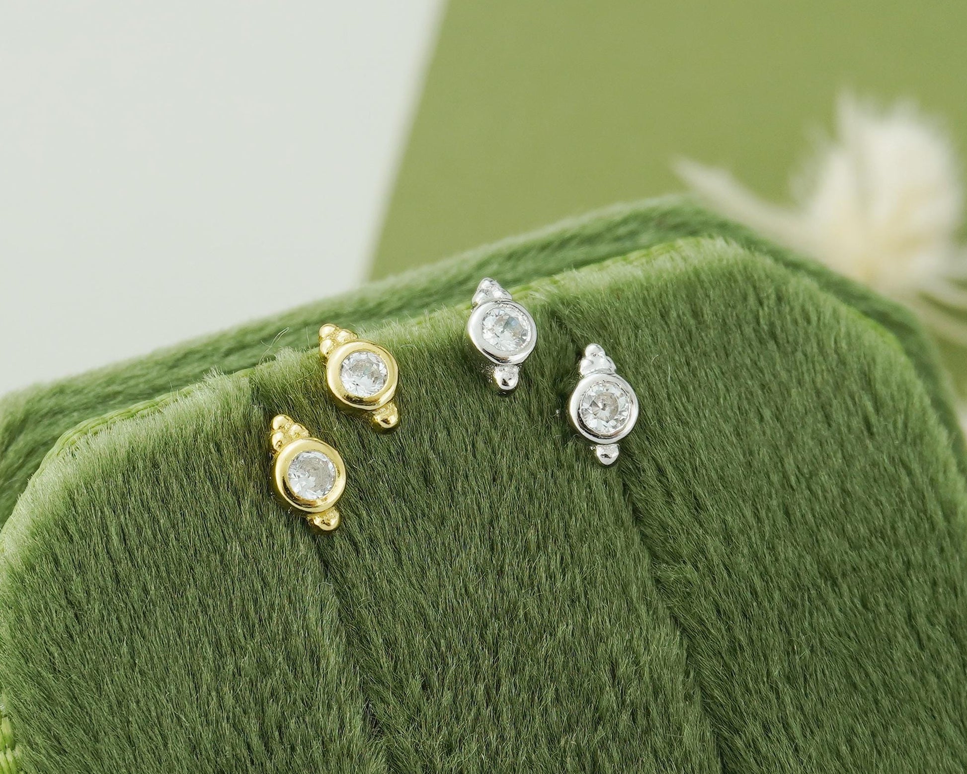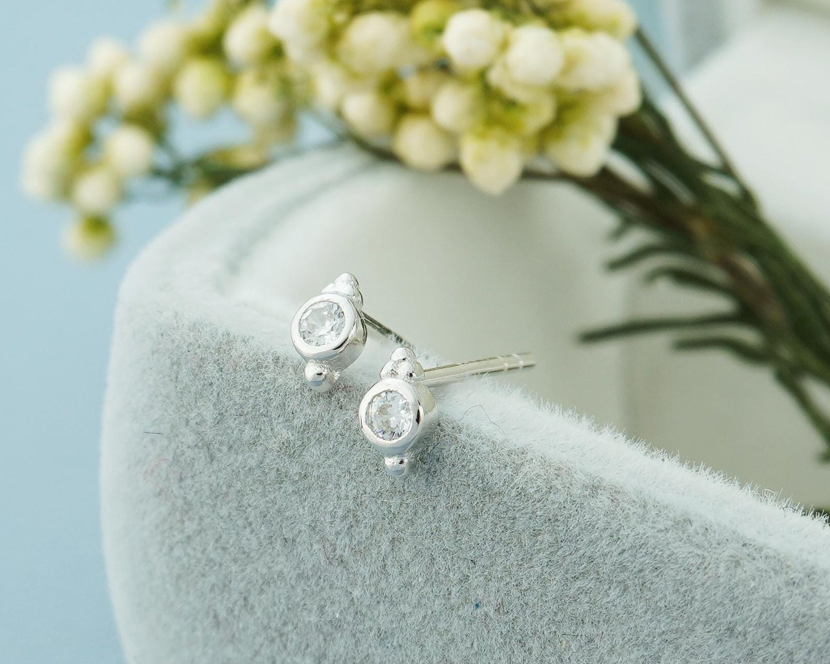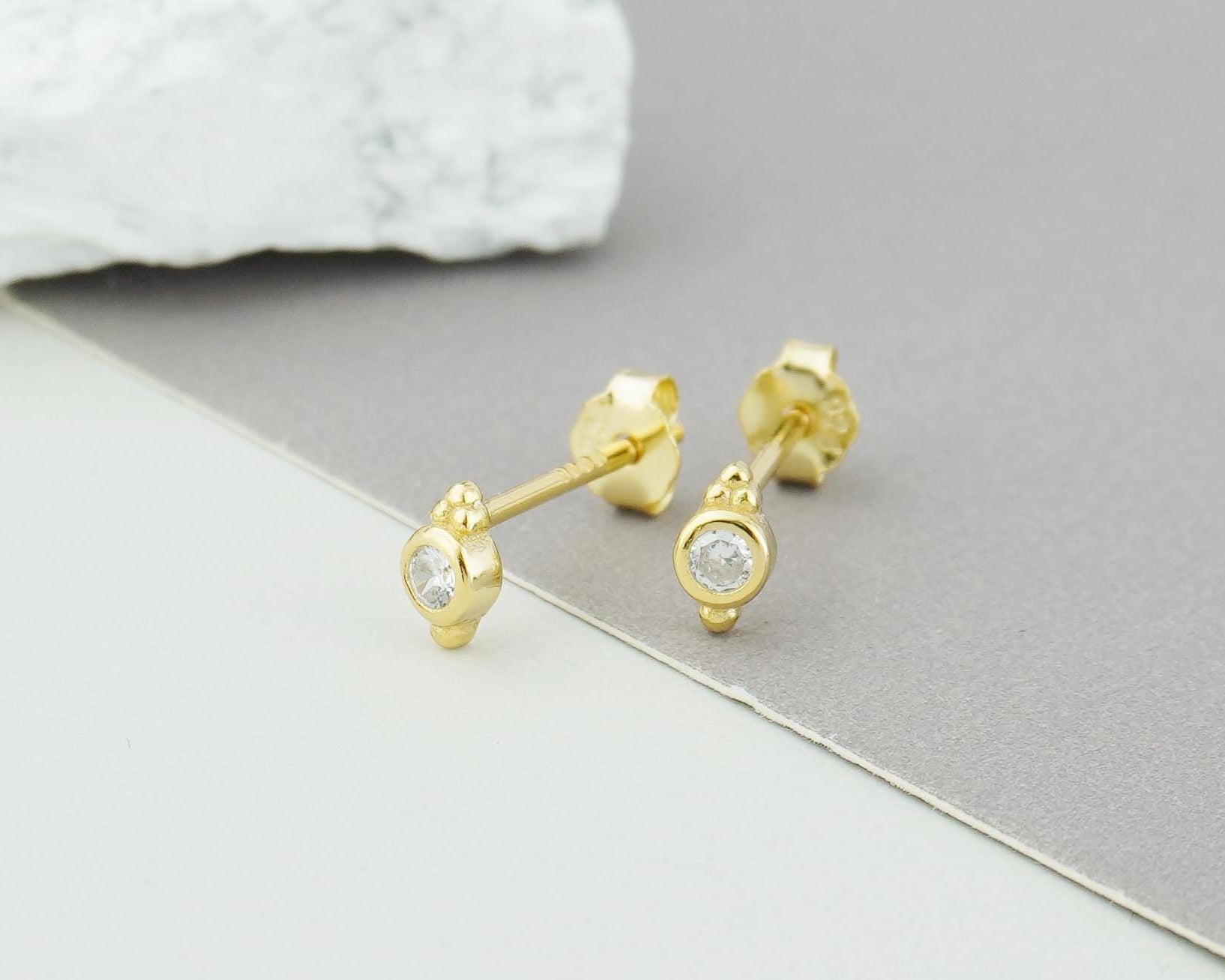 Pair of VERY TINY Sterling Silver CZ Bezel Stud Earrings in Rhodium or 18ct Gold Plated