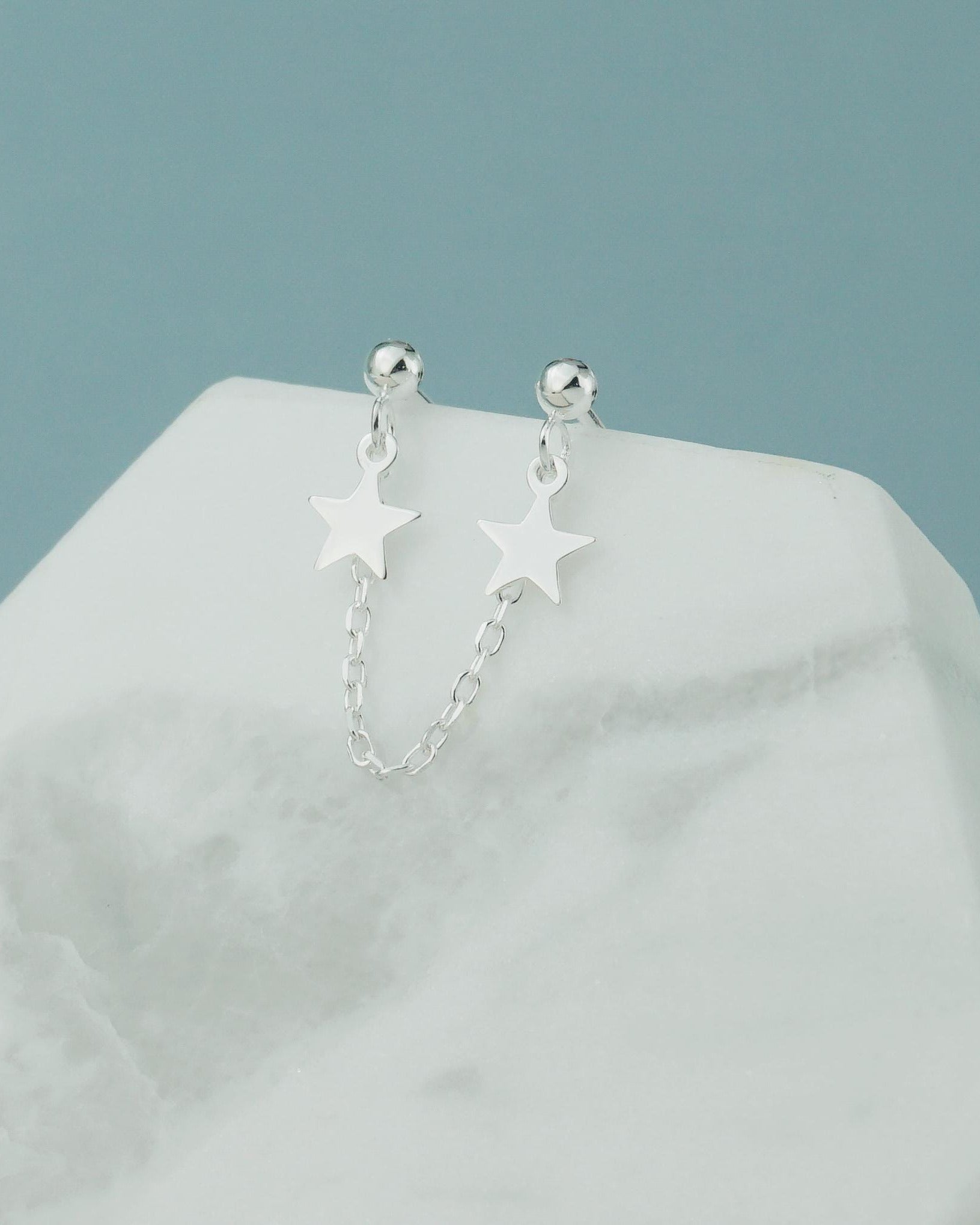 Pair of Double Stellar Stud Earrings in Sterling Silver, Dangly Celestial Twin Stars on Chain
