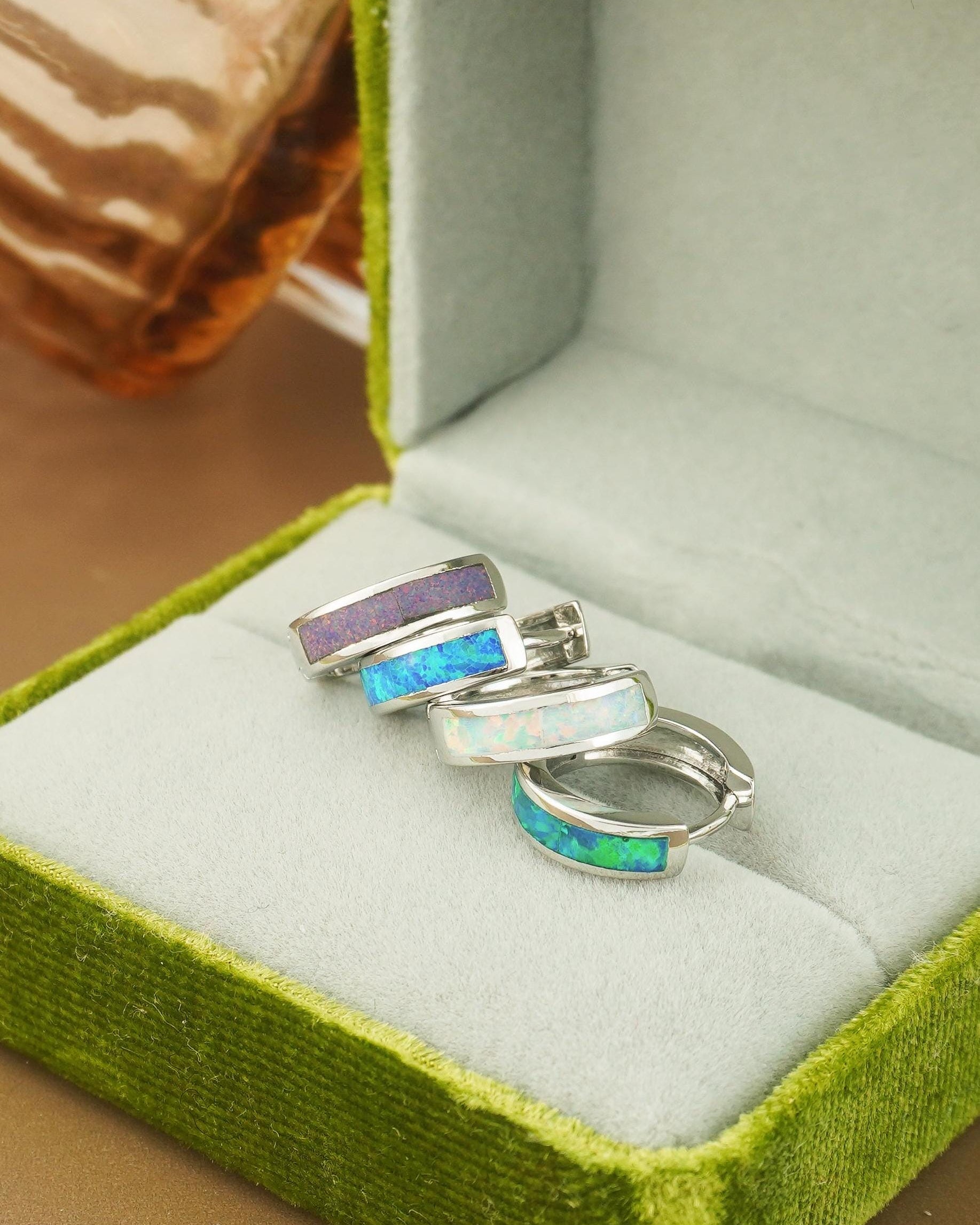 Pair of Elegant Opal Inlay Huggie Hoop Earrings in Rhodium Plated Brass, Purple, Blue, Green or White Stone
