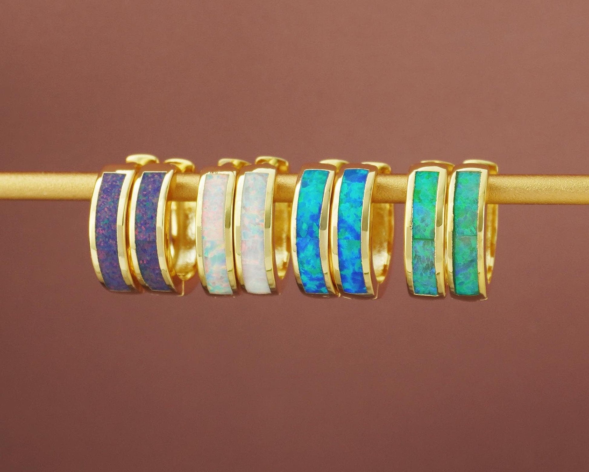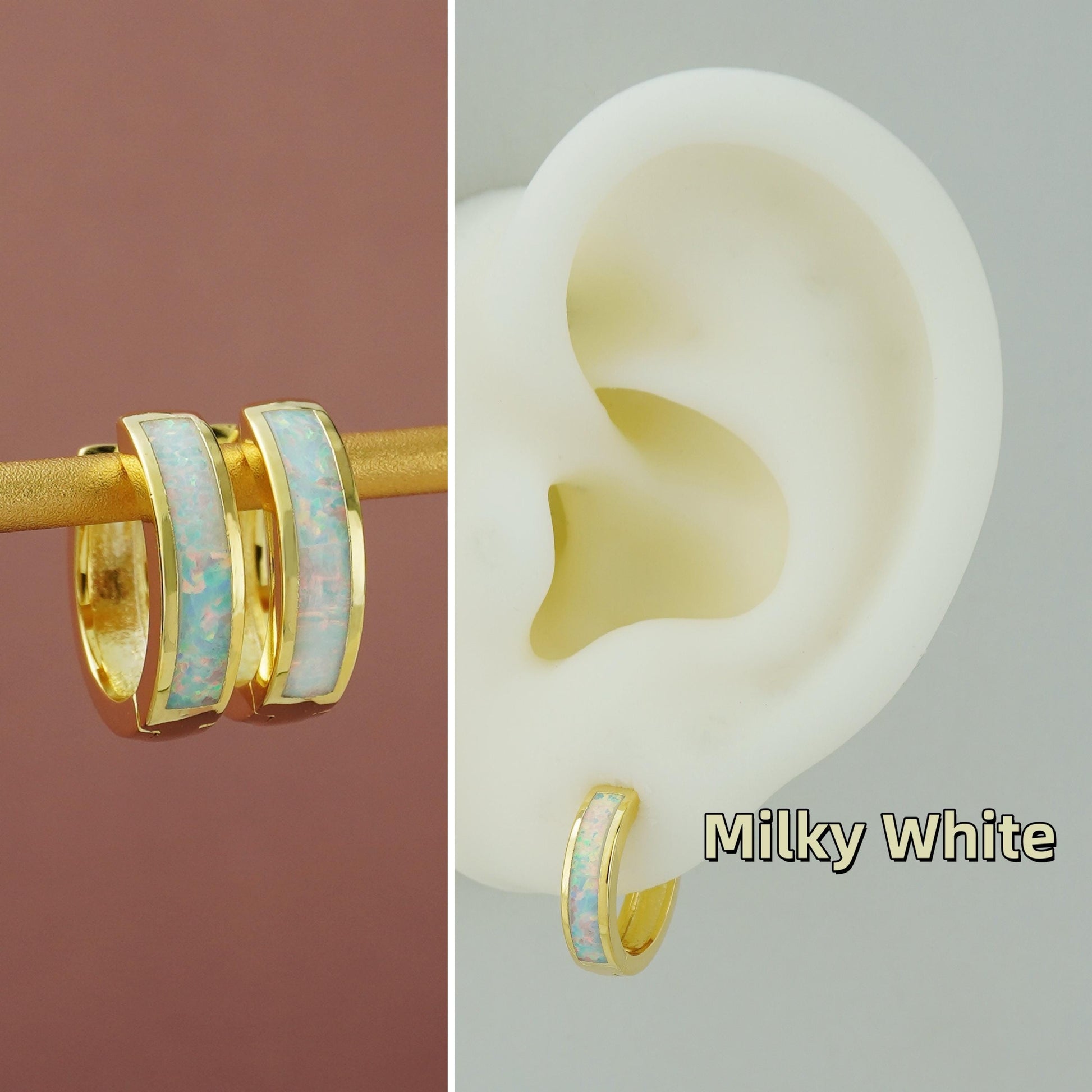 Also available in ✨White Gold(Rhodium) Plated✨: Pair of Elegant Opal Inlay Huggie Hoop Earrings in Brass, Purple, Blue – SilverDrey