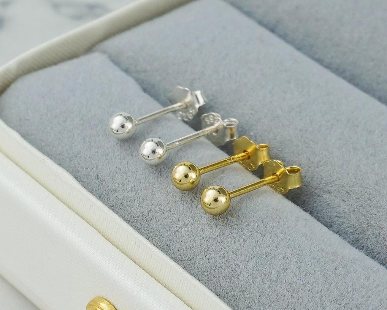Pair of Little Ball Stud Earrings, 3/4/5mm Round Sphere in Sterling Silver or 14ct Plated Gold