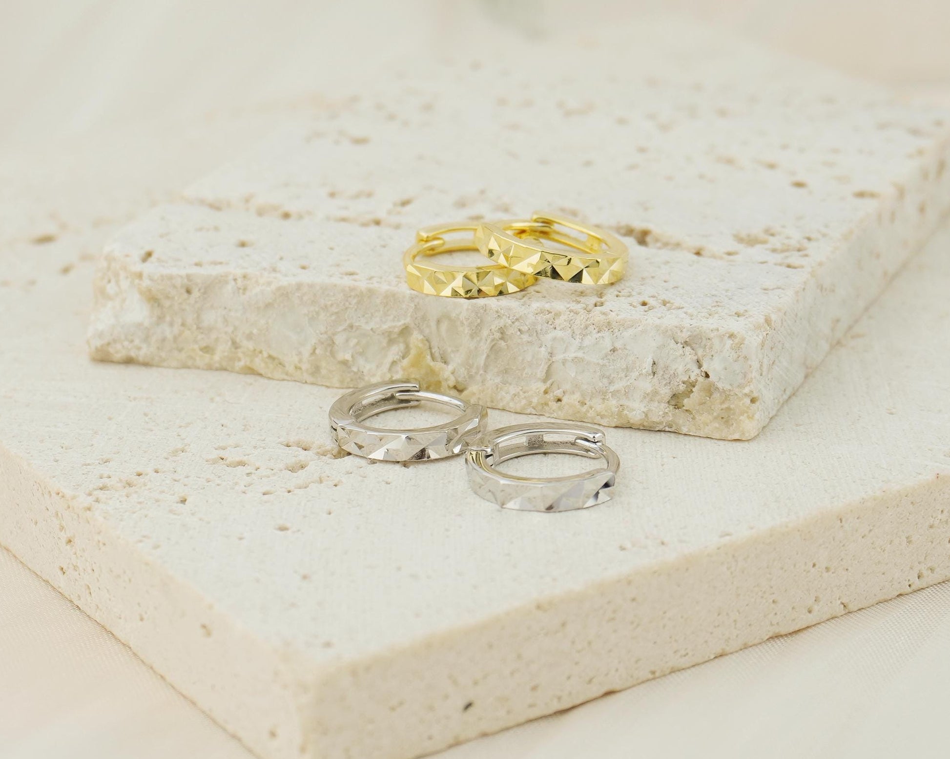 Pair of Minimalist Diamond Cut Huggie Hoop Earrings in Sterling Silver or 18ct Gold Plated, Simple Faceted Jewelry