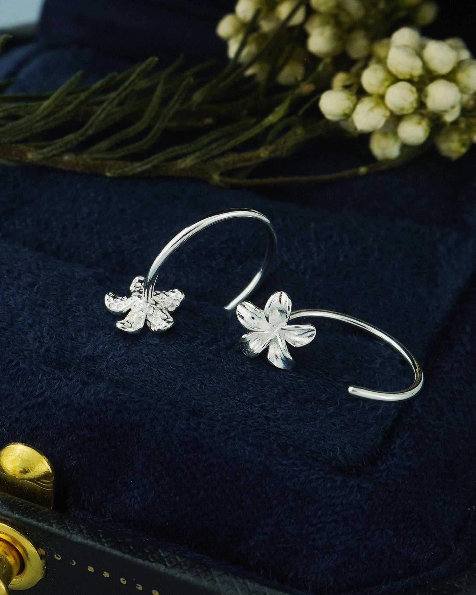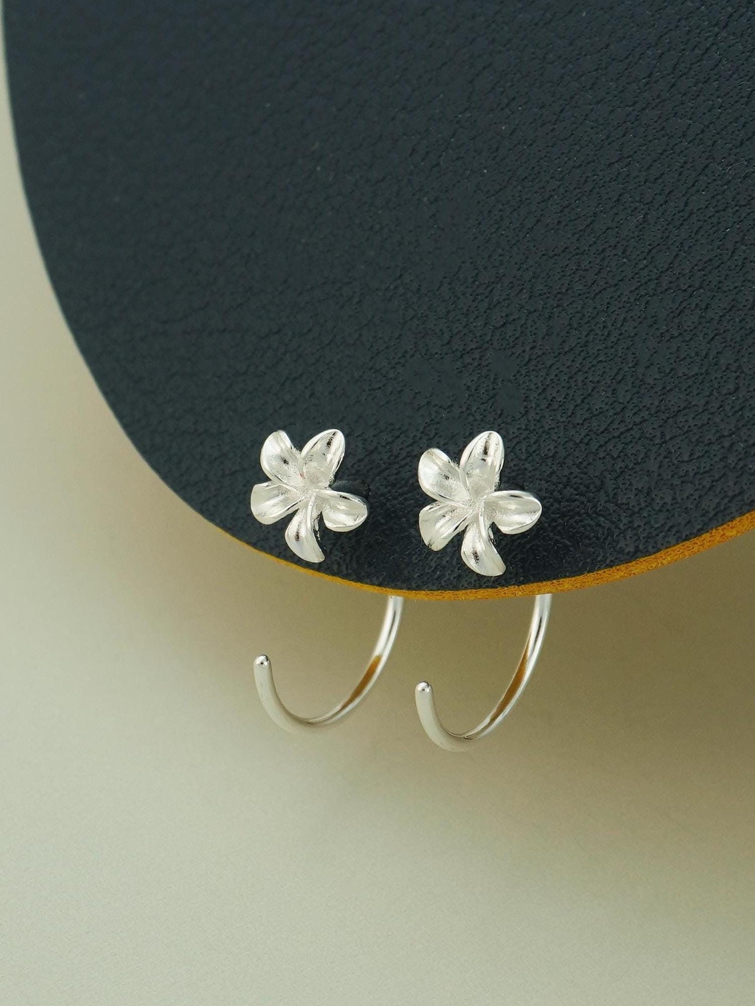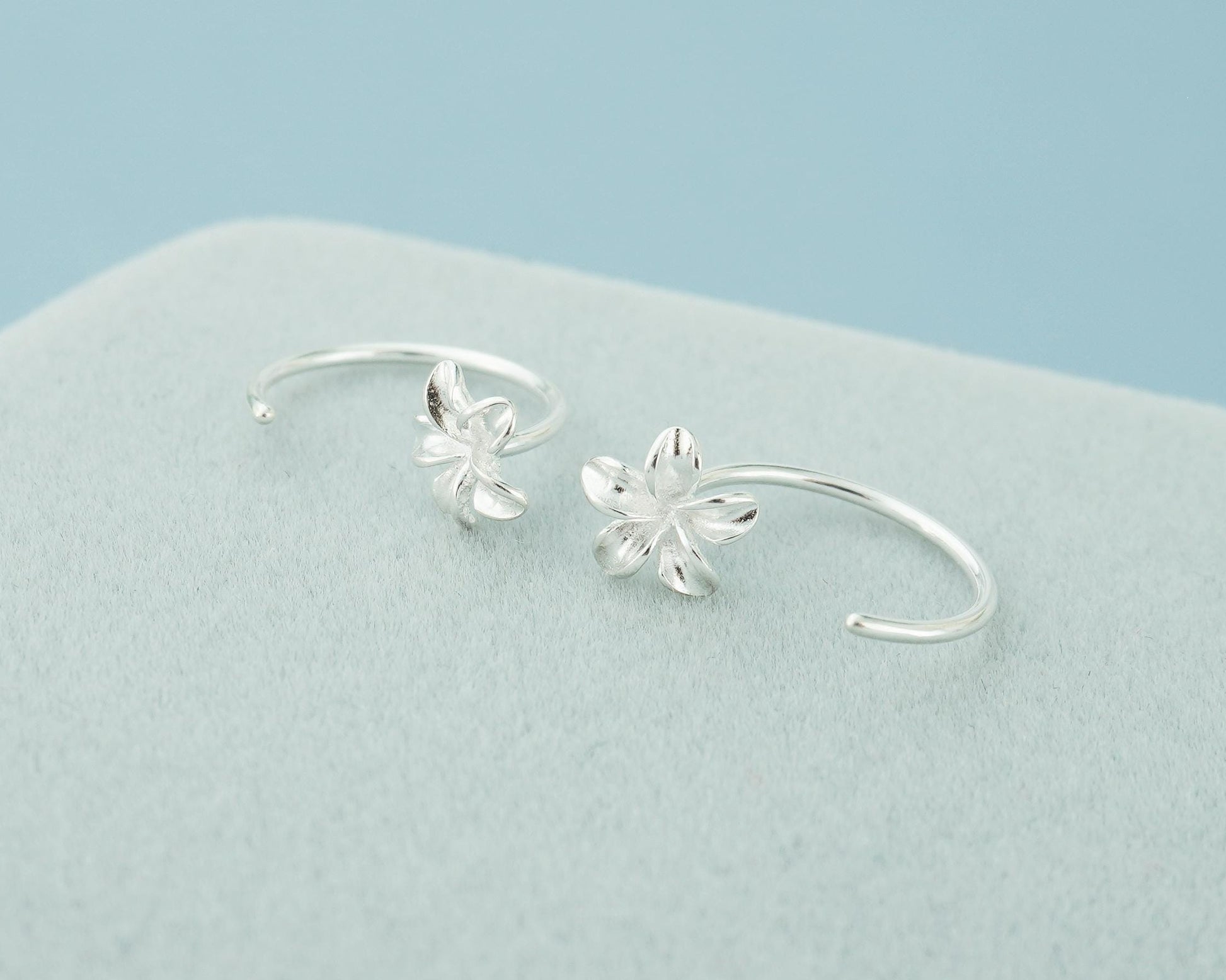 Pair of Plumeria Flower Open Hoop Threader Earrings in Sterling Silver