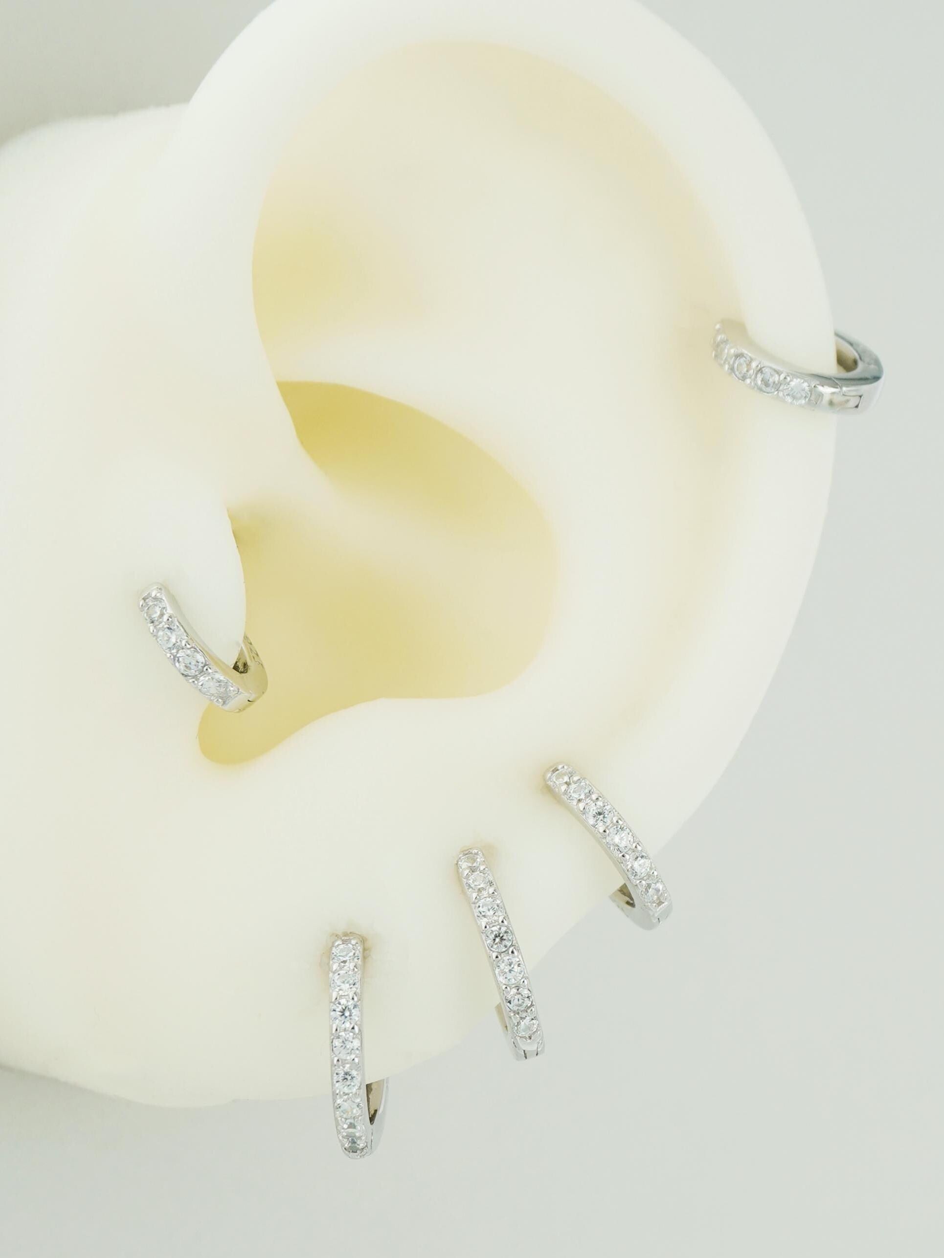 Pair of Skinny CZ Paved Huggie Hoop Earrings in 5 Sizes, Gold or Rhodium Plated Sterling Silver