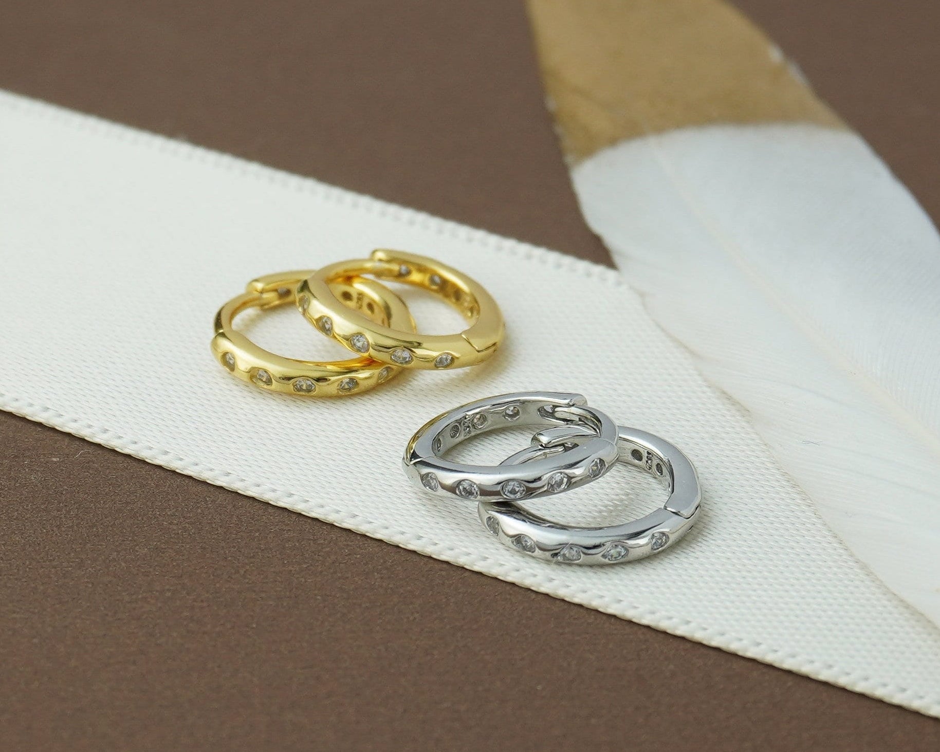Pair of Sterling Silver Skinny Huggie Hoop Earrings with Smooth Round Edge, 3 Size, Gold or Rhodium Plated, Front & Back CZ