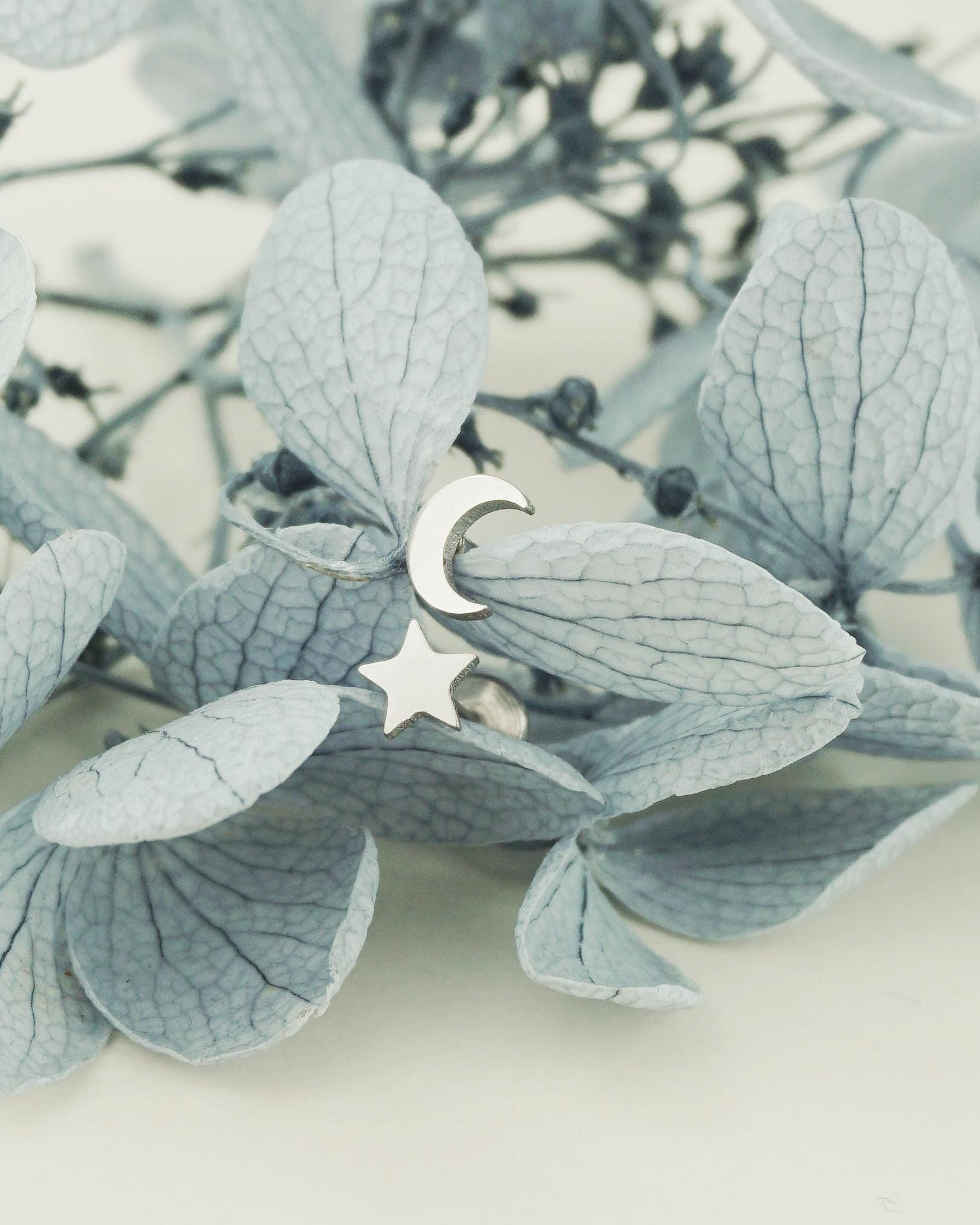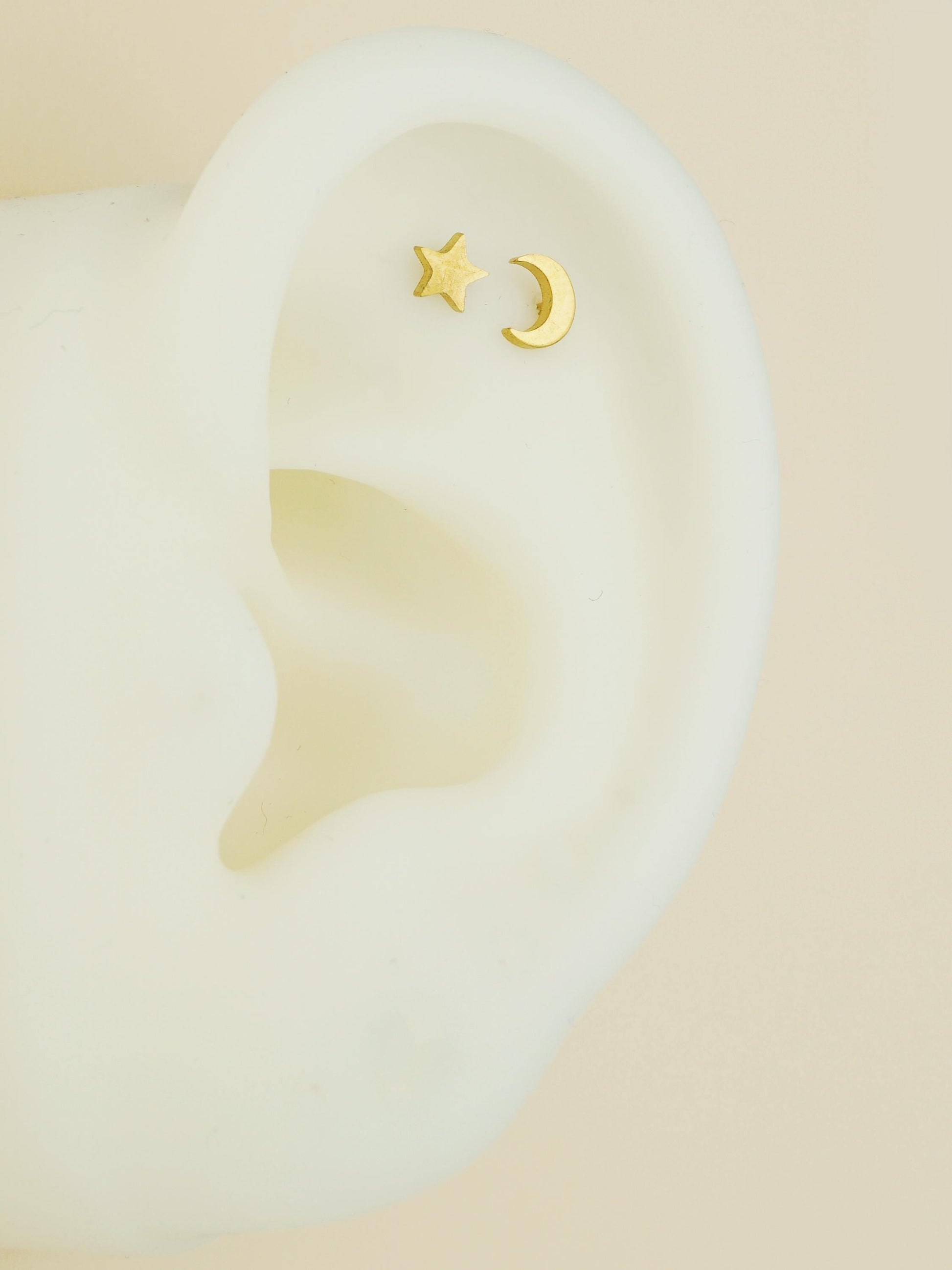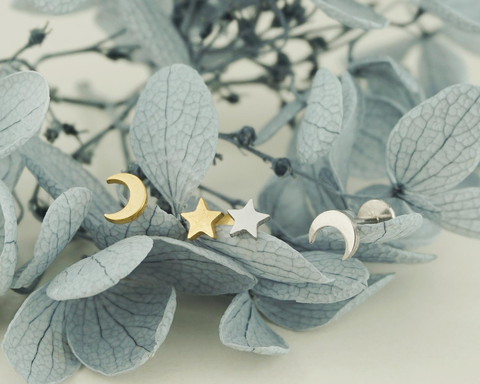 Pair of Stainless Steel Tiny Crescent Moon & Star Push-in Stud Earrings in Steel or Gold