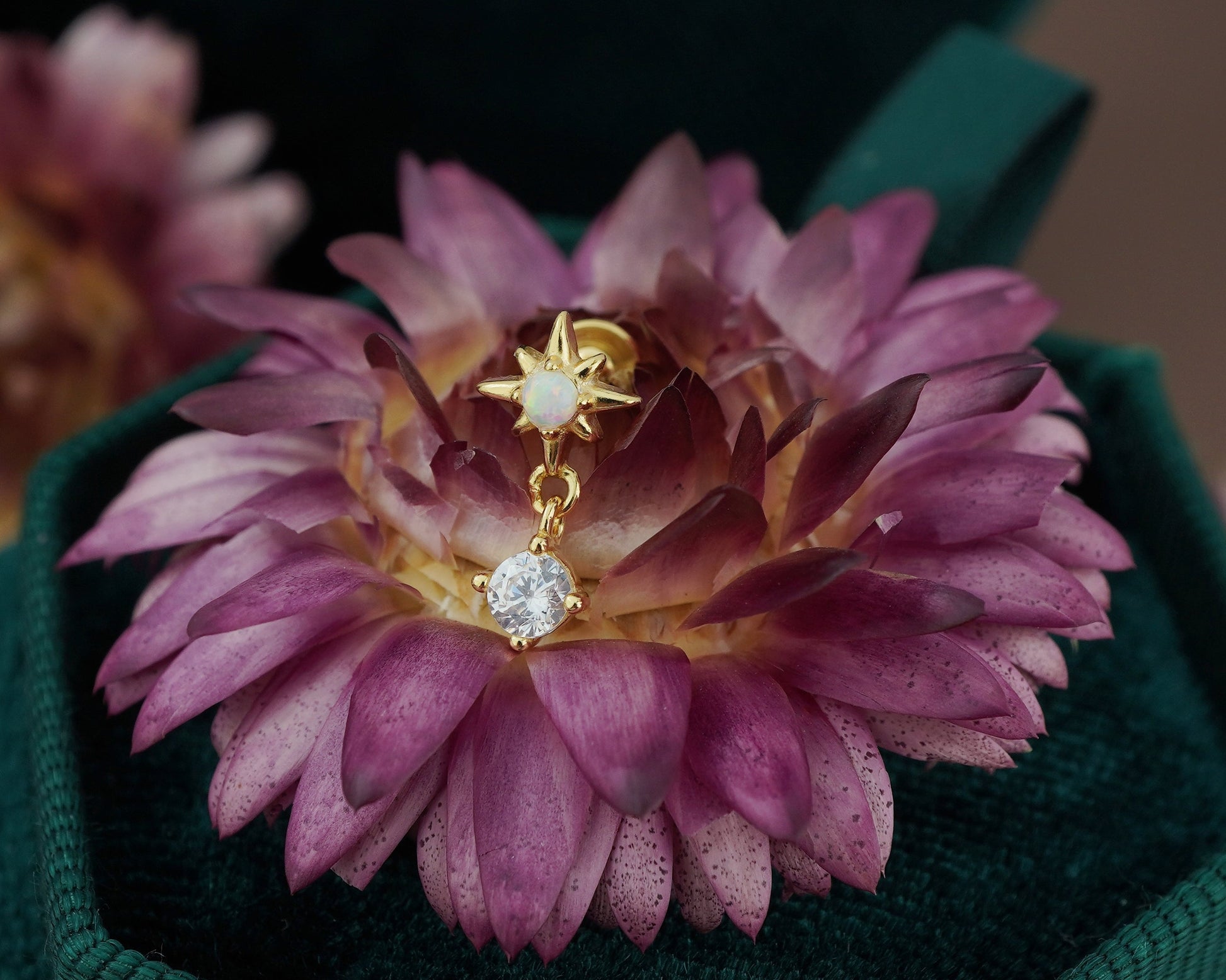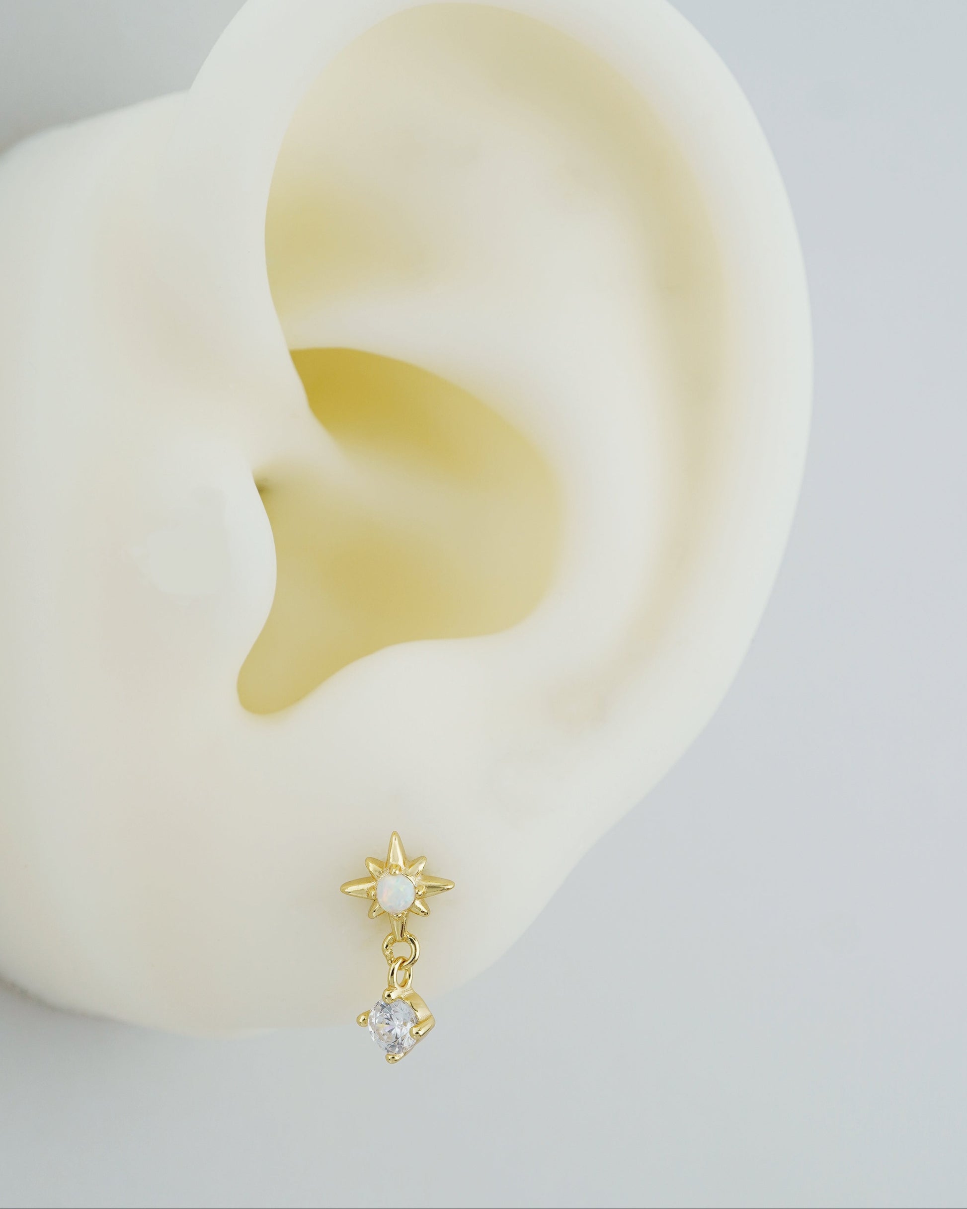 1 pc of Fire Opal Starburst Sterling Silver Stud Earring in 18ct Gold Plated, Celestial Design with a Dangly CZ Stone