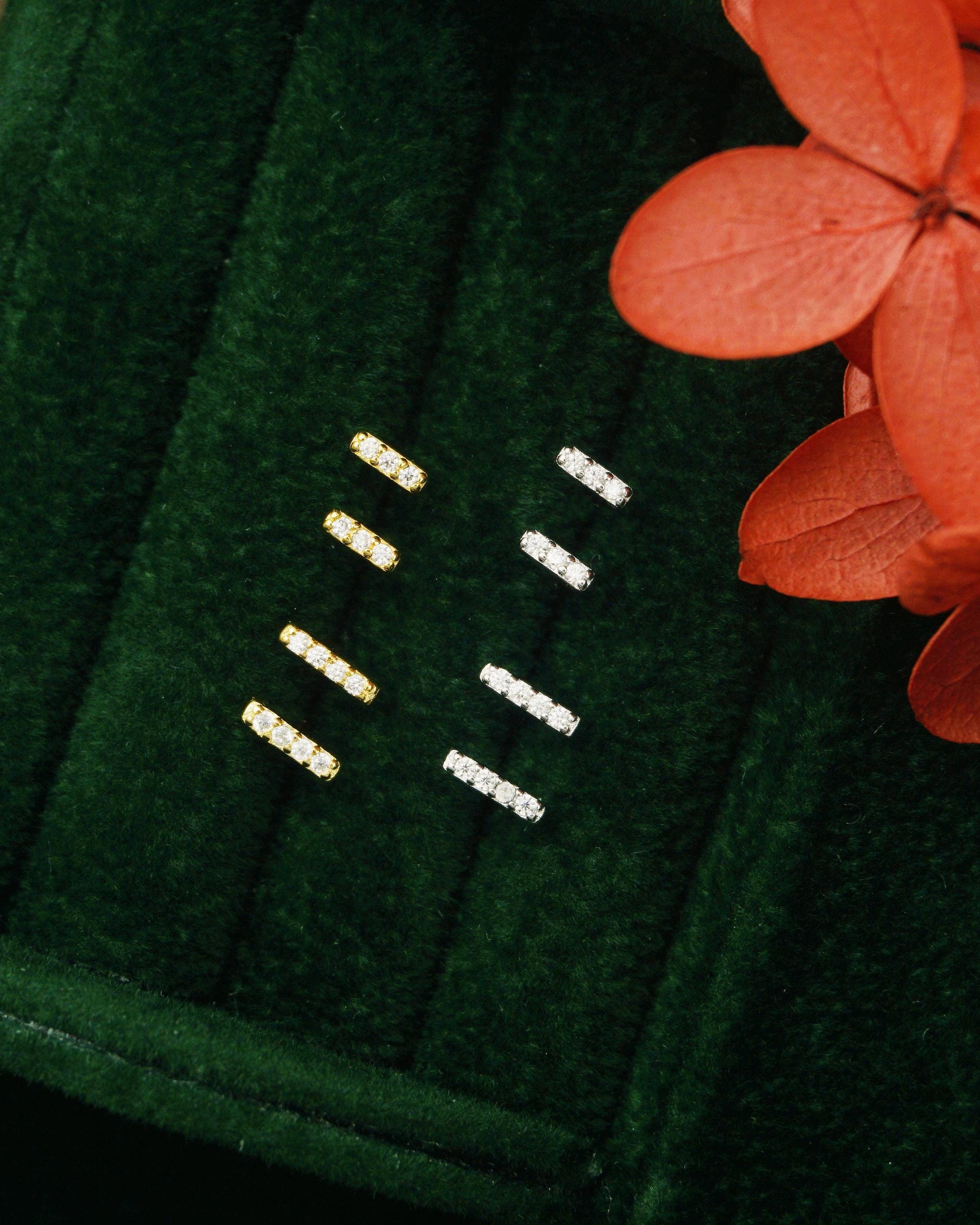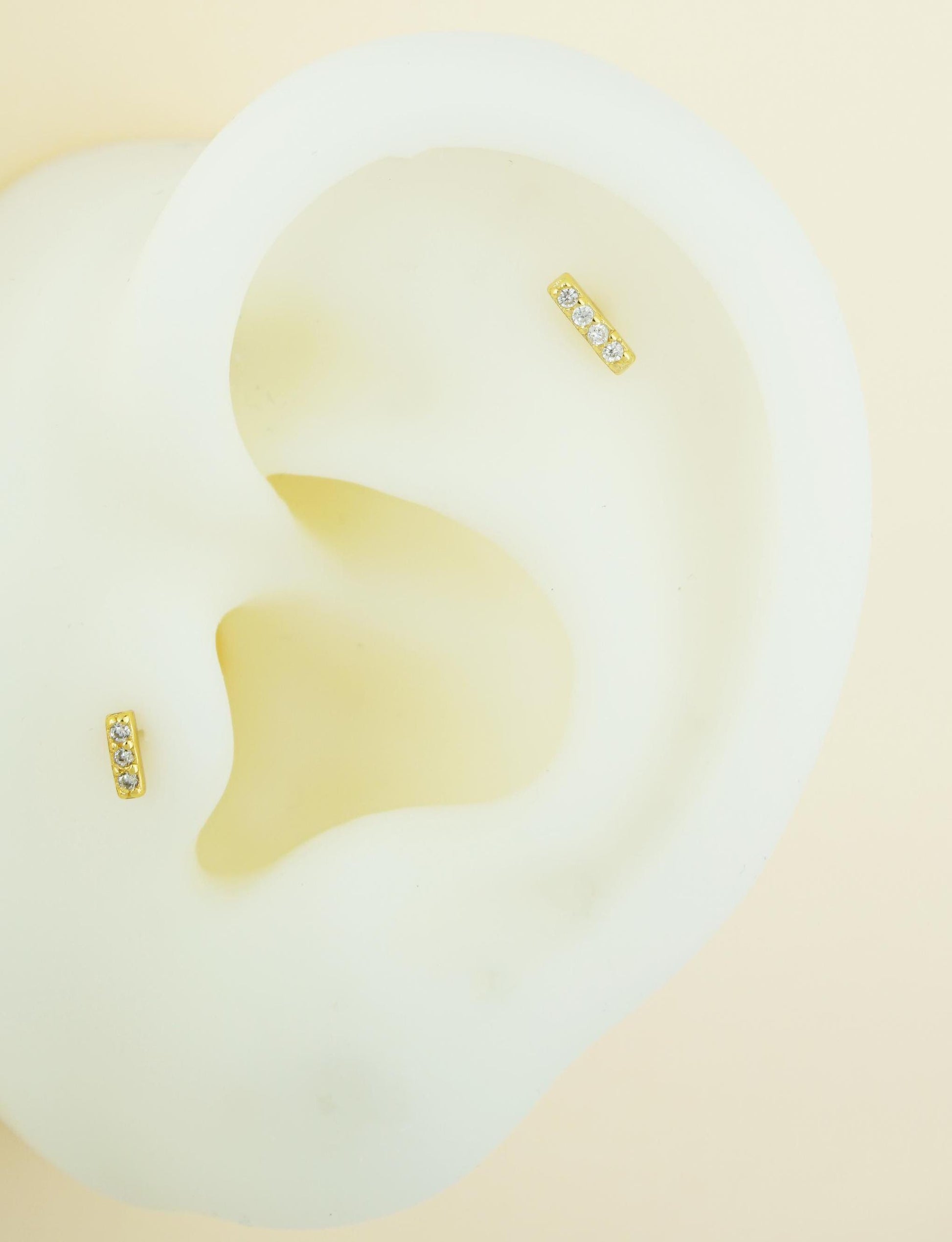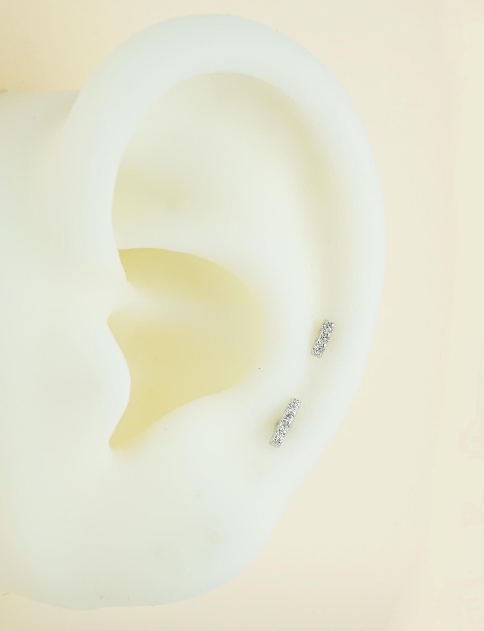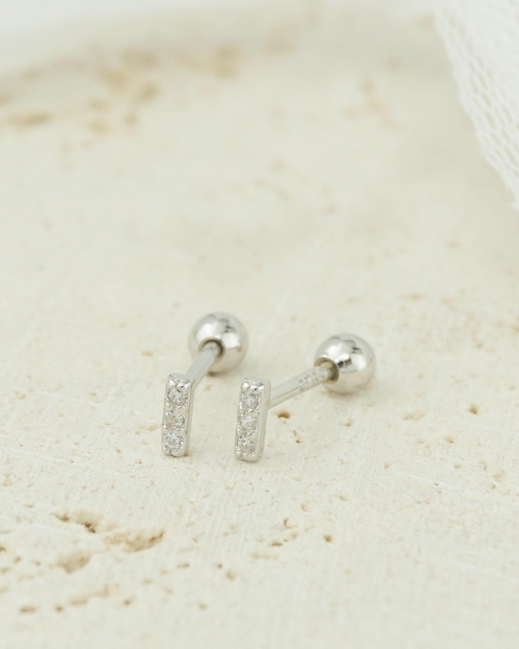 Pair of VERY TINY Paved Bar Sterling Silver Stud Earrings in Silver or Plated Gold, Sparkly CZ Stones, Simple Screw Ball Back