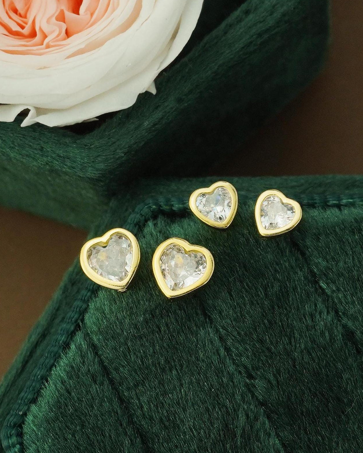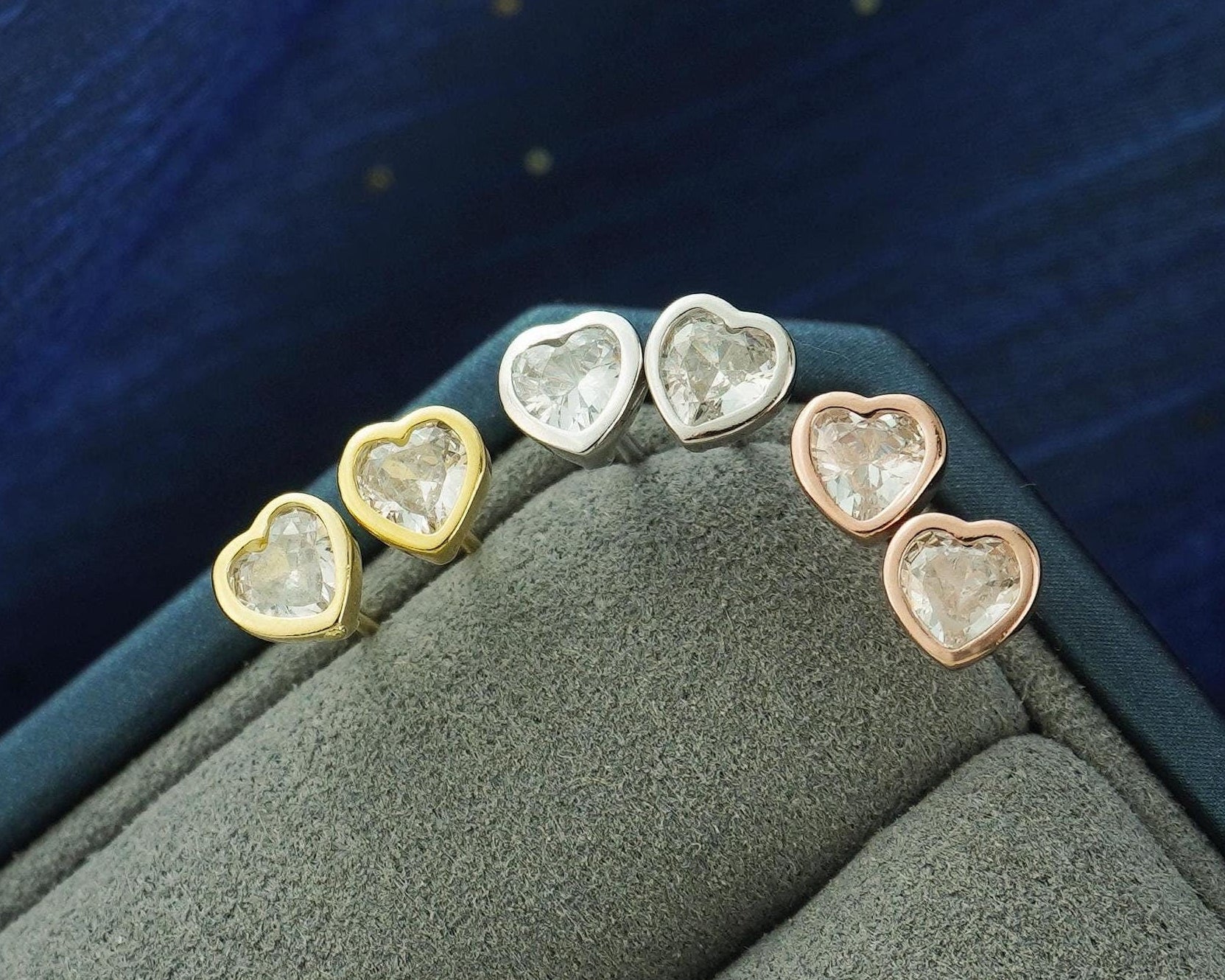 Pair of Tiny CZ Heart Sterling Silver Stud Earrings in Rhodium, 14ct Gold or Rose Gold Plated, 2 Sizes Simple Stacking Earlobe Jewelry