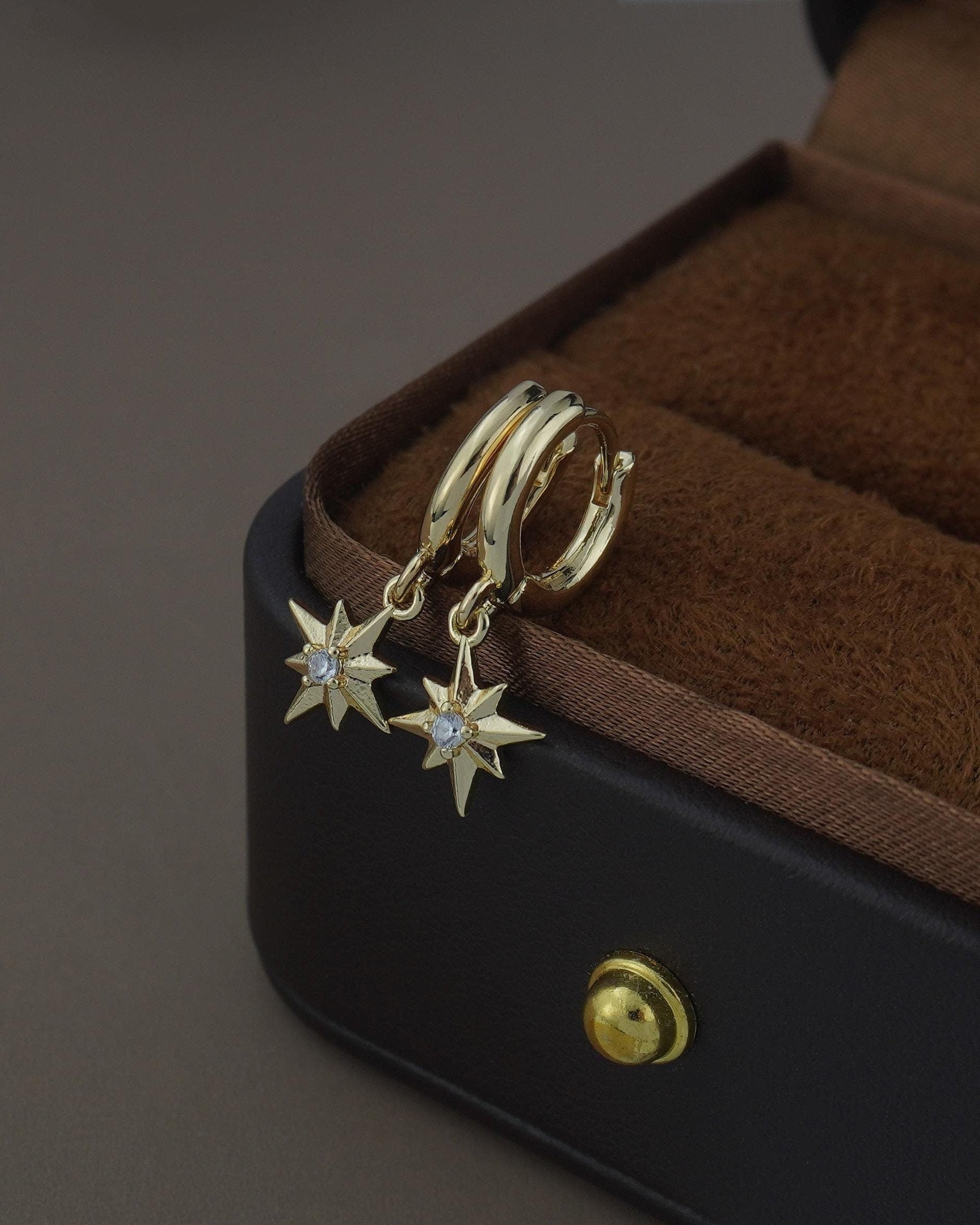 Pair of Starburst Huggie Hoop Earrings in Gold Plated Brass, Sunburst Charm with Sparkly CZ