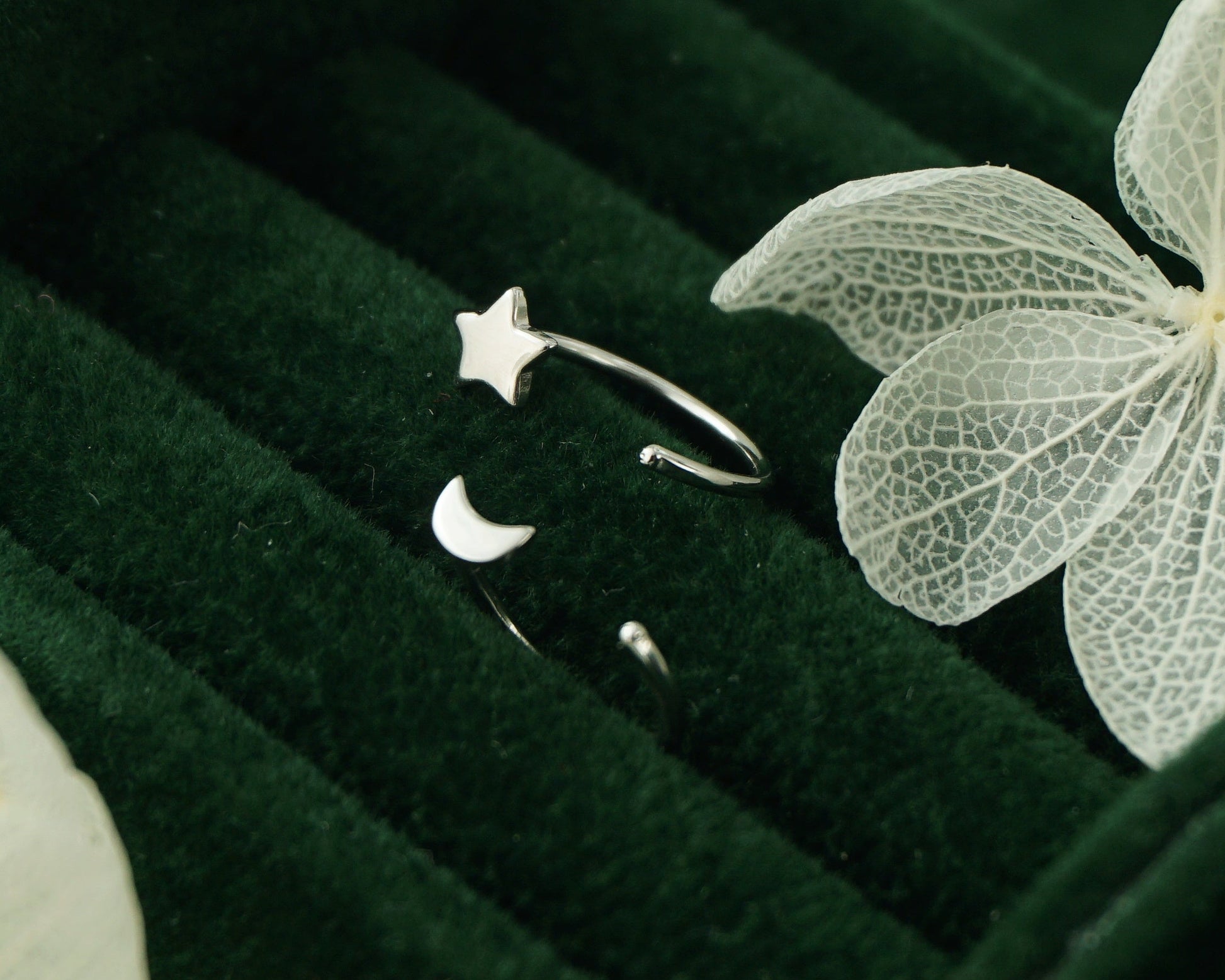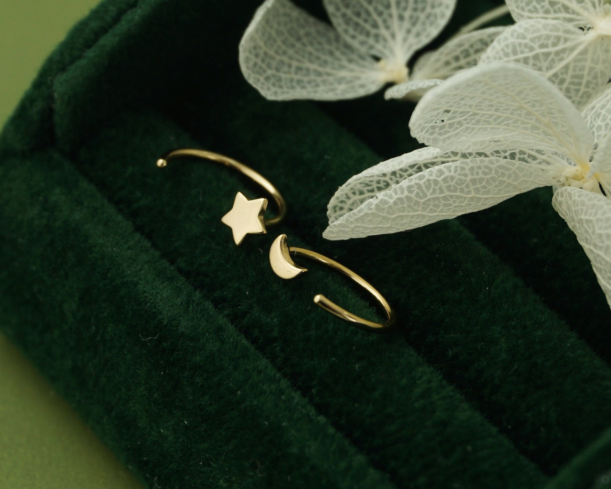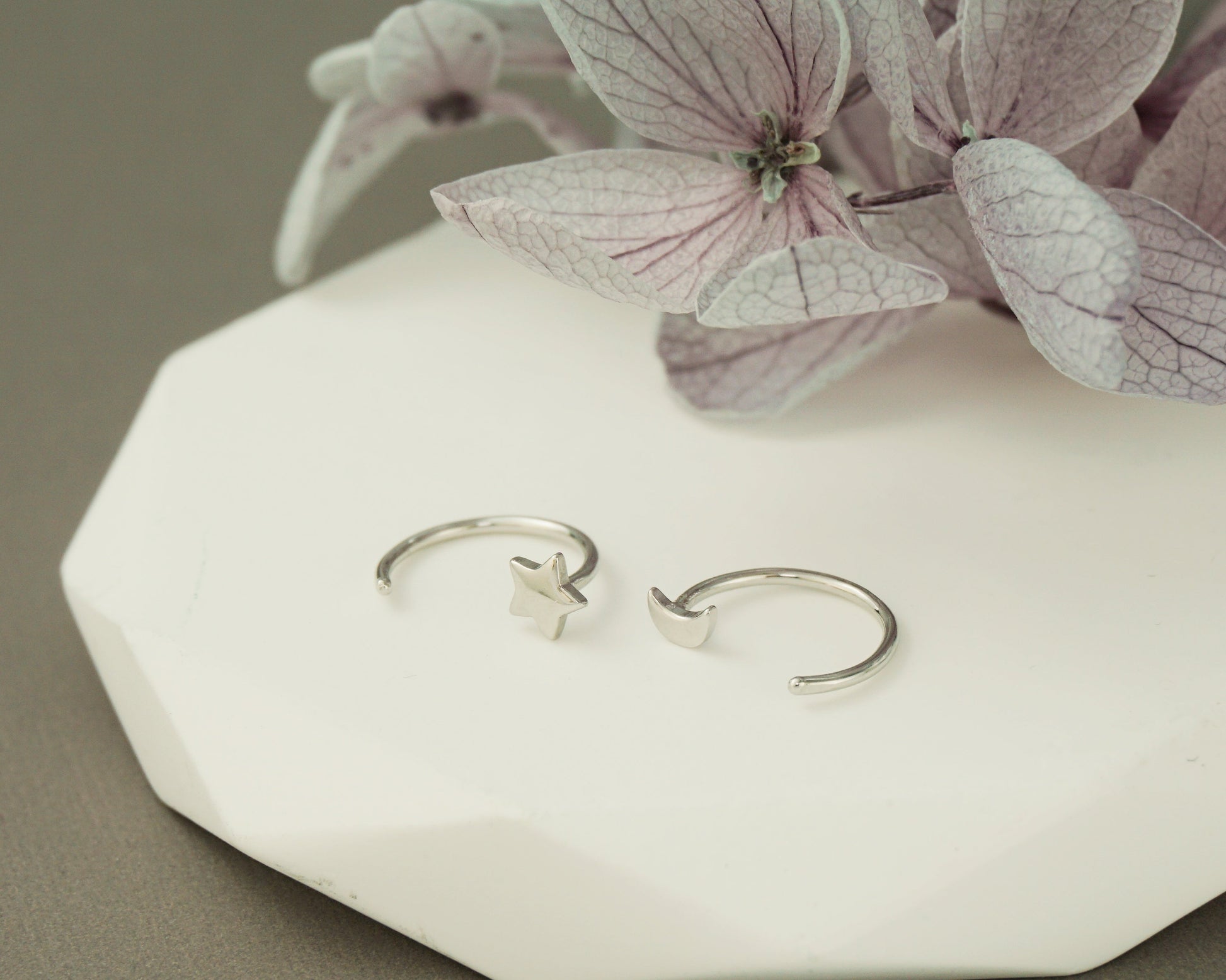 Pair of Tiny Sterling Silver Star and Crescent Moon Threader Hoop Earrings in Rhodium, 14ct Gold or Champagne Gold Plated