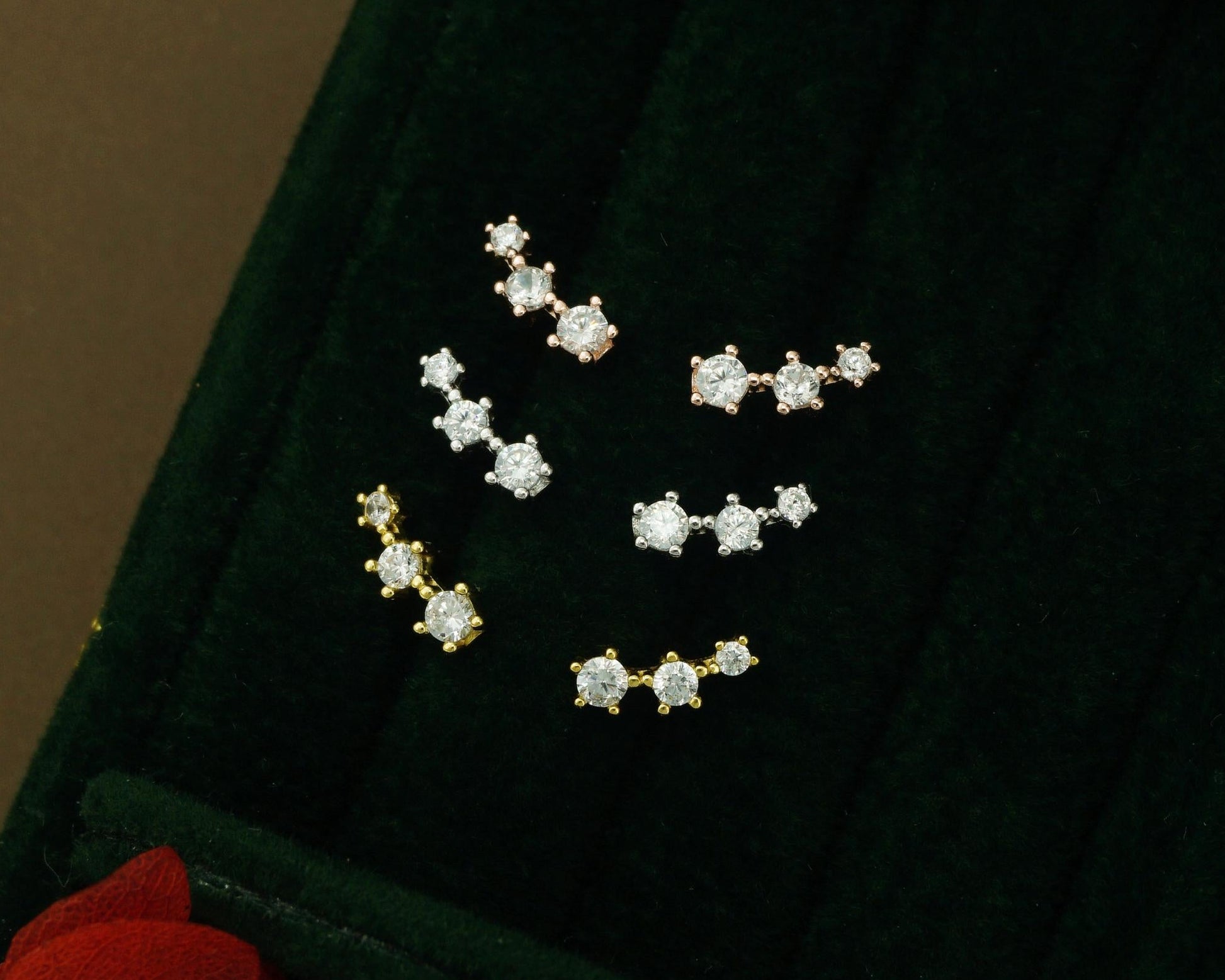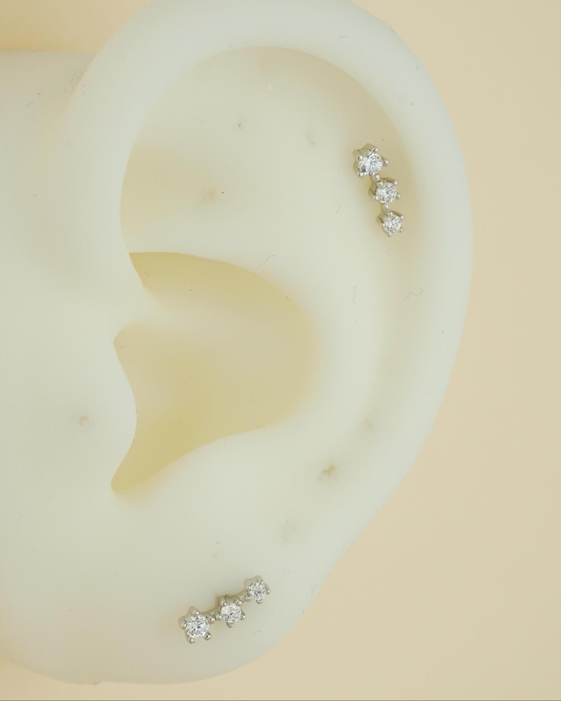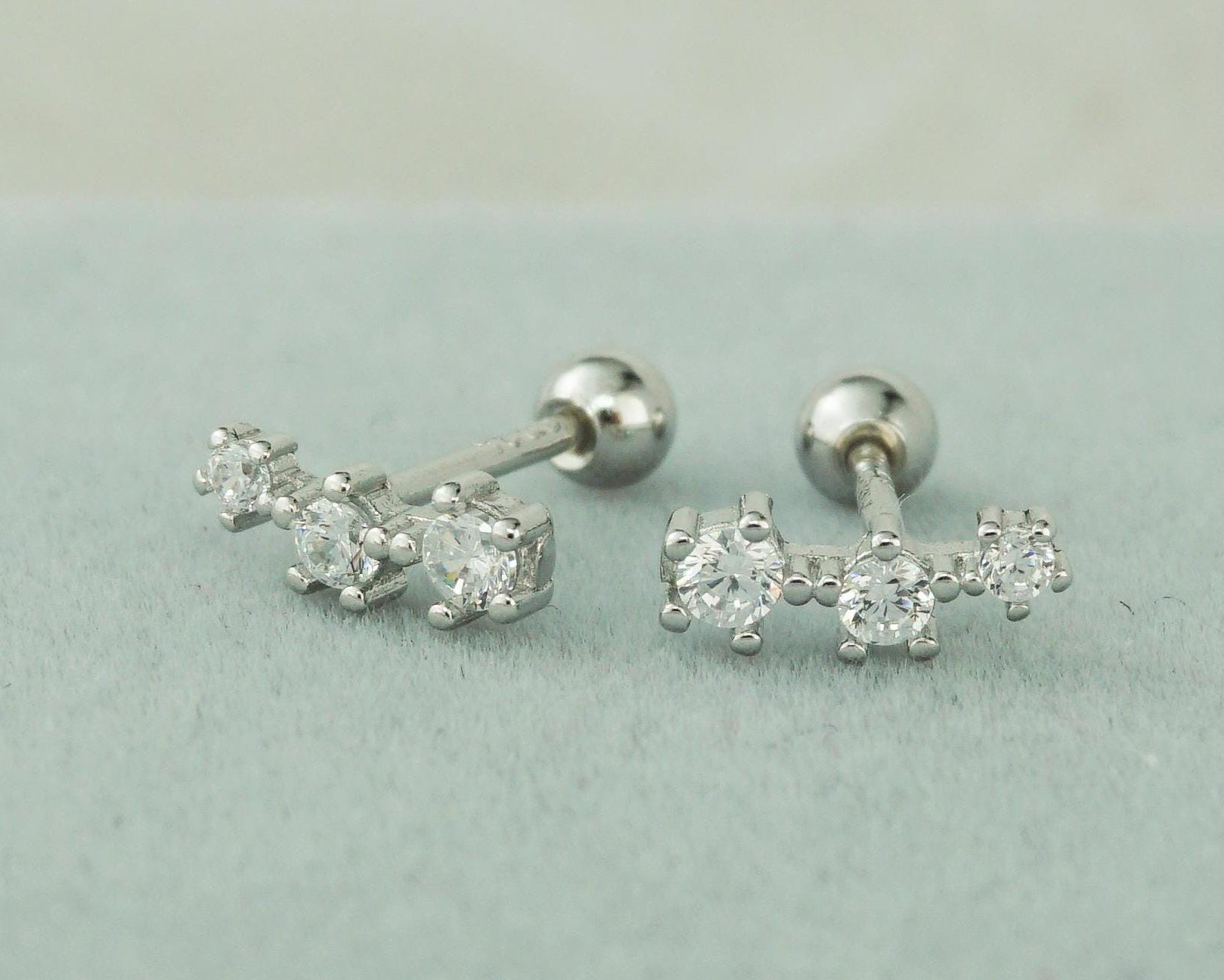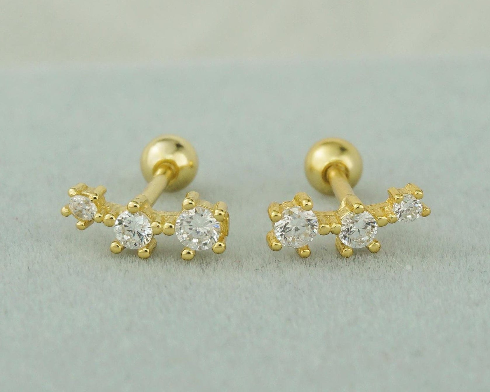 Pair of Tiny Sterling Silver Trio CZ Stud Earrings in Rhodium, Gold or Rose Gold Plated, Dainty Star Crawler with Screw Ball Back